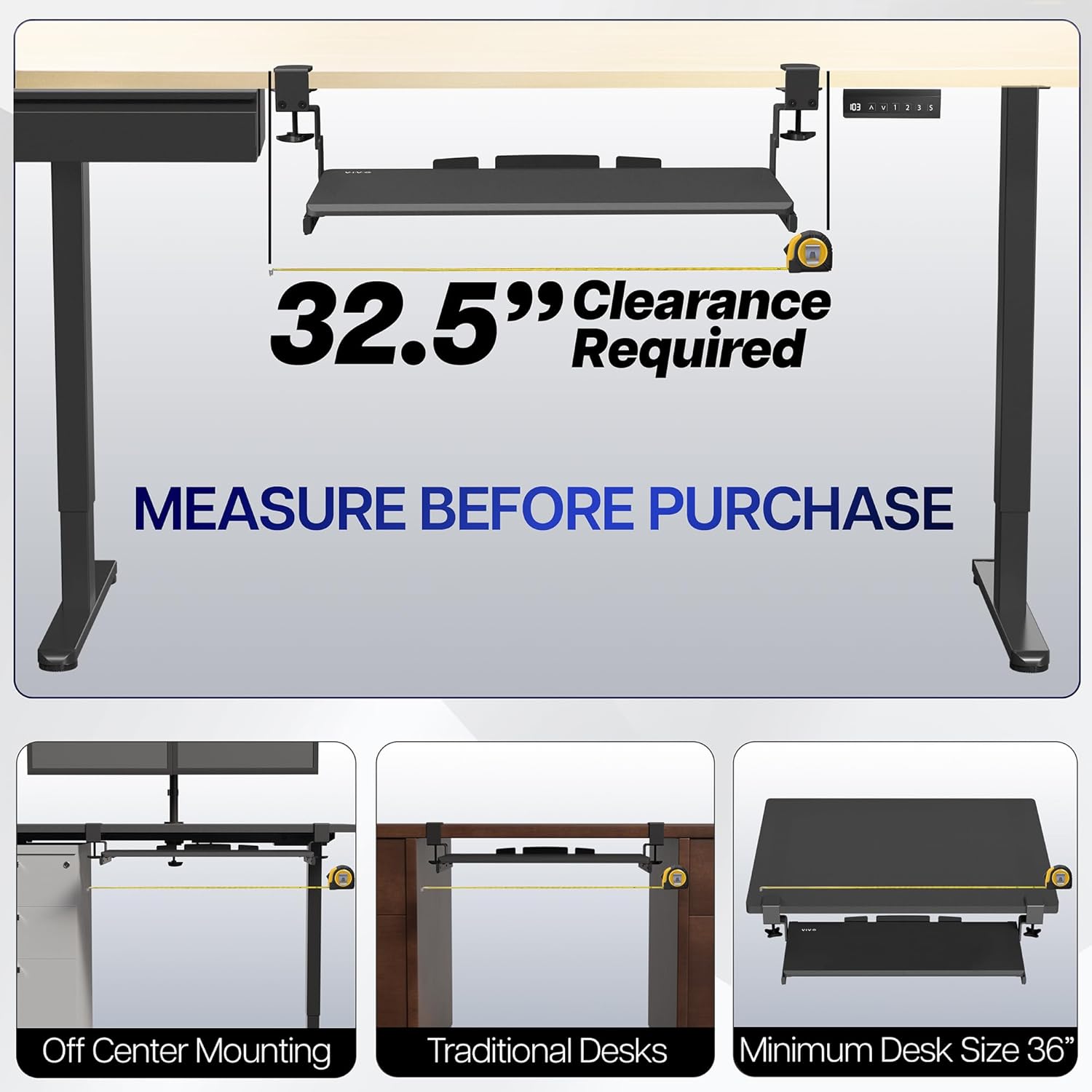 - Save Desk Space - This 26.8" (33" including clamps) x 11" under-desk keyboard tray holds your keyboard, mouse, and other small accessories below the desktop for added work space. Please Note: The total length from clamp to clamp is 33", so please make sure you have that much space on your desk before purchasing. --Patent Pending--