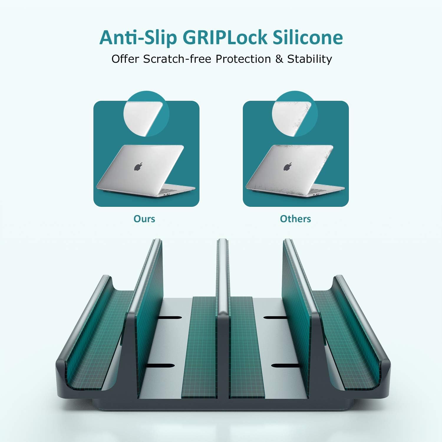 - GRIPLock - HD Protection - Anti-Tip, Anti-Slip: We tested more than the 20 top vertical laptop dock models before perfecting the SPACEMax, engineering it from Solid Core Heavy Duty Aluminum for weighted balance and heft, then added GRIPLock Silicone Lining so your device stays upright, secure and scratch free.