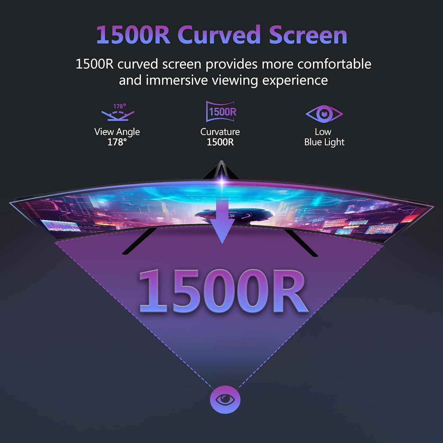 - 1500R Curved Gaming Monitor: 1500R curved monitor proved to add an immersive touch while gaming or watching movies, helping to fill our peripheral vision, enlarging the field of view to a greater extend. The curved monitor provides the maximum immersion, fully engages your life in every aspects.