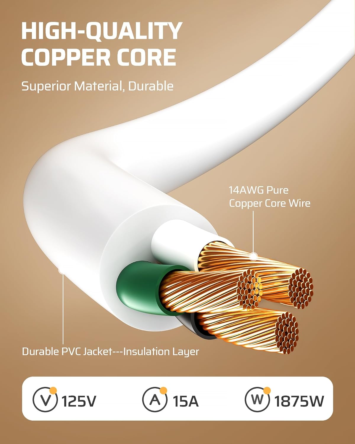 - Perfect for Indoor Use -The SJT 14/3 gauge power cable is safe and reliable for the high-power household uses, 15A / 125V / Max 1875W, indoor use only