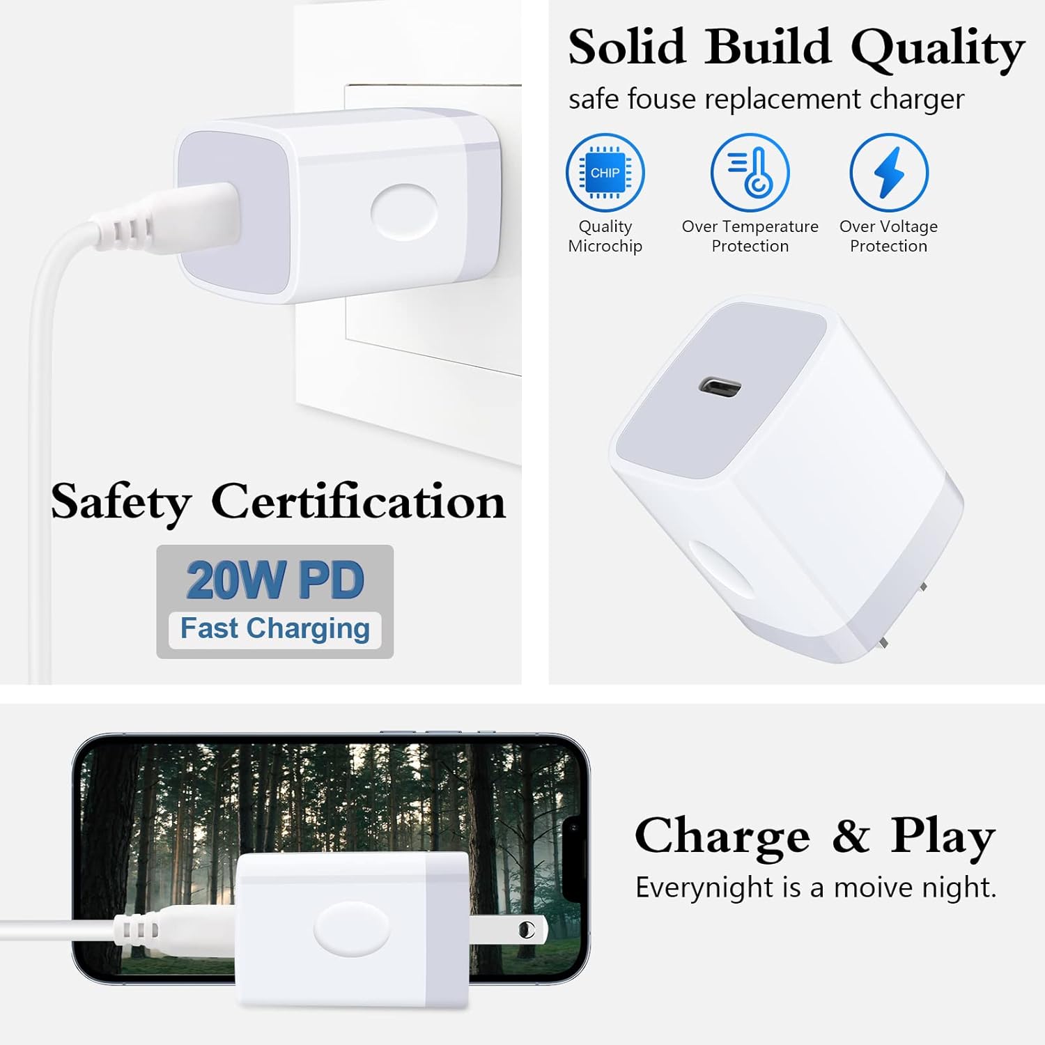 - 【Certified Safe & Reliable Wall Charger 】:iPhone 14 Wall Charger Adopts with over-heated protection ,over-current protection, over-charging protection, Built-in high-performance switching power transformer to ensure stable voltage output, safe isolation of various components, to avoid short circuit and noise and Charging will automatically stop when battery is full.