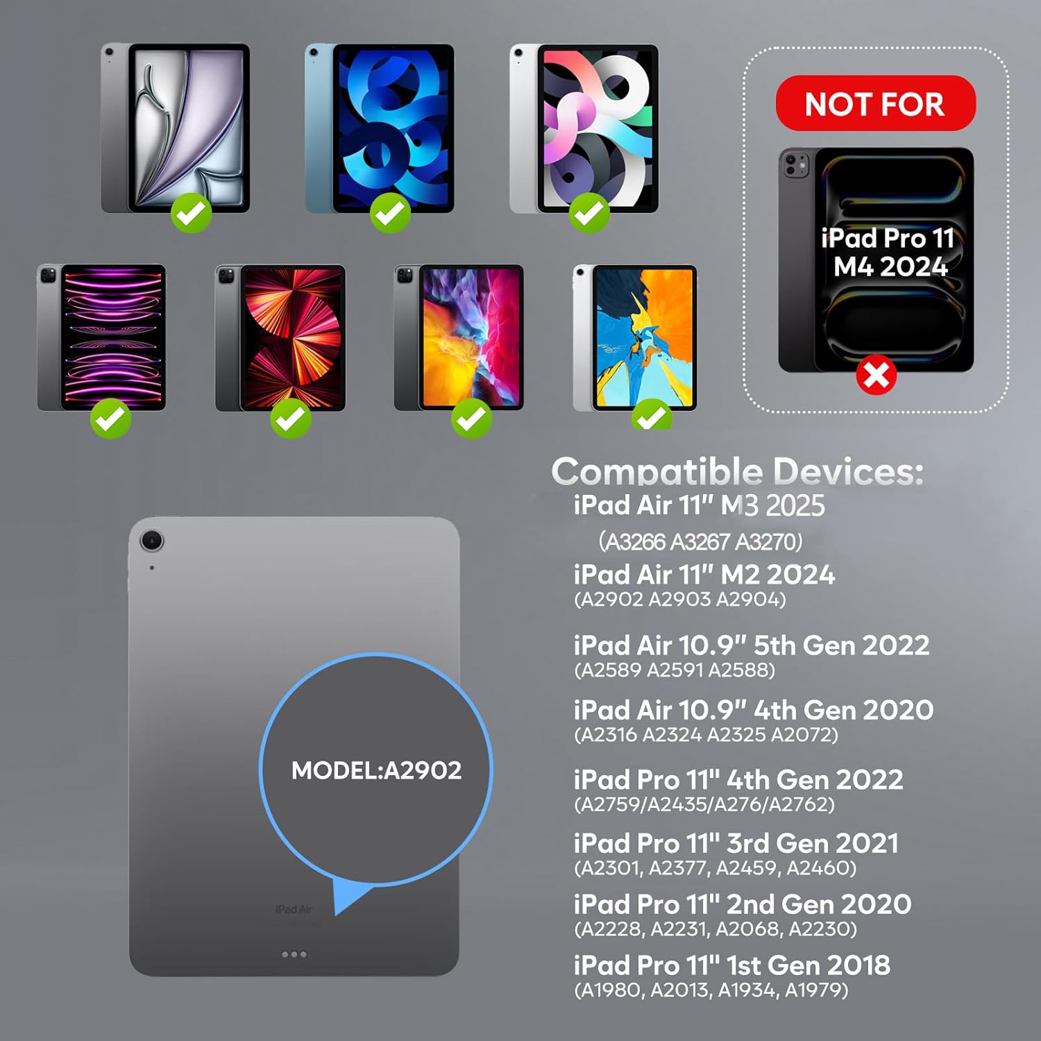 - Designed for iPad Air 11-inch 7th (M3) 2025 (model number: A3266 A3267 A3270) / iPad Air 6th 11 Inch (M2) 2024 (model number: A2902 A2903 A2904)/iPad Air 5th 4th Gen 10.9'' 2022 2020 (Model: A2589/A2591/A2324/A2072/A2316/A2325) / iPad Pro 11'' 4th Gen 2022 (Model: A2759/A2435/A2761/A2762) / iPad Pro 11'' 3rd 2021 (Model: A2377/A2459/A2301/A2460) / iPad Pro 11'' 2nd 2020 (Model: A2228/A2068/A2230/A2231) / 1st Gen 2018 (Model: A1980/A2013/A1934)