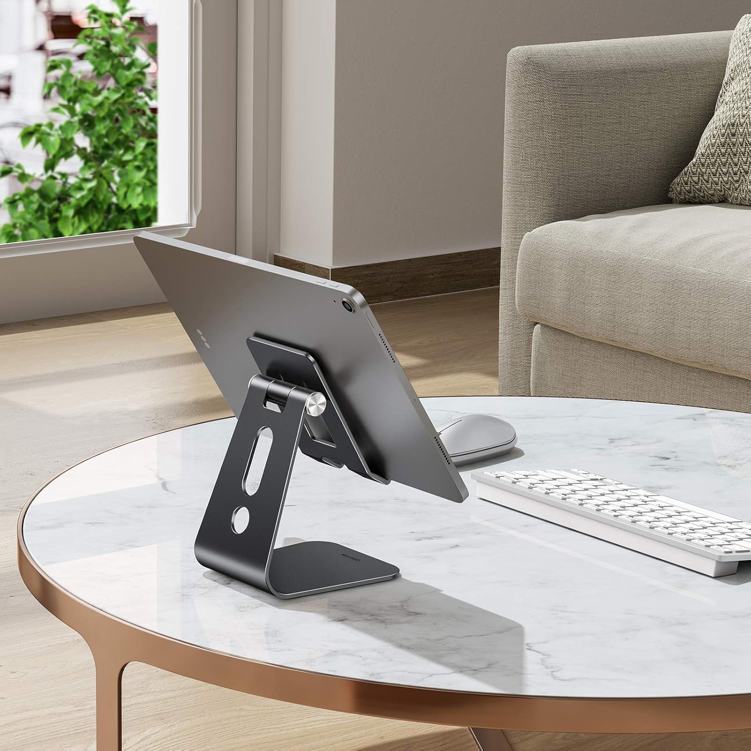 - STURDY & STABLE: The tablet stand is made of premium, reinforced aluminum alloy. It securely supports tablets and prevents wobbling or falling. Moreover, the weighted base ensures stability on every surface.