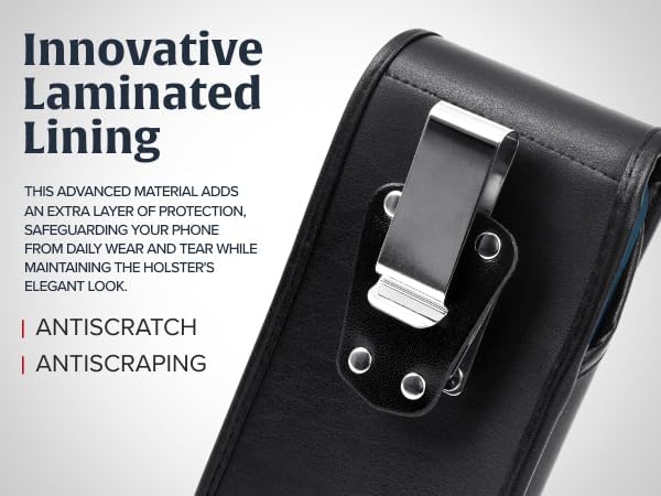 - PATENTED HEAVY-DUTY BELT CLIP: This phone belt holder features a specially designed patented rotating rtcheting clip for a secure carry. The removable, rotatable clip locks with a D-ring mechanism, gripping tightly to your belt and keeping your phone holster secure while on the move. A durable choice in cell phone cases & covers, this stylish iPhone belt holder for men is a secure carry solution for everyday use.