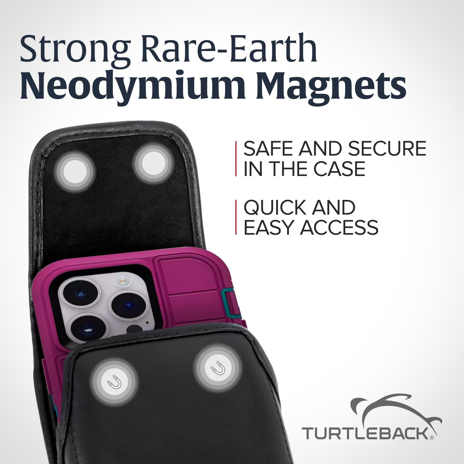 Turtleback Belt Clip for iPhone 16 Pro, 16e, 15 pro 14 Pro 13 Pro -Large- Fits w/Defender Bulky Style Cases, Premium Black Leather, Vertical Belt Holder, Magnetic Closure HD Rotating Belt Clip