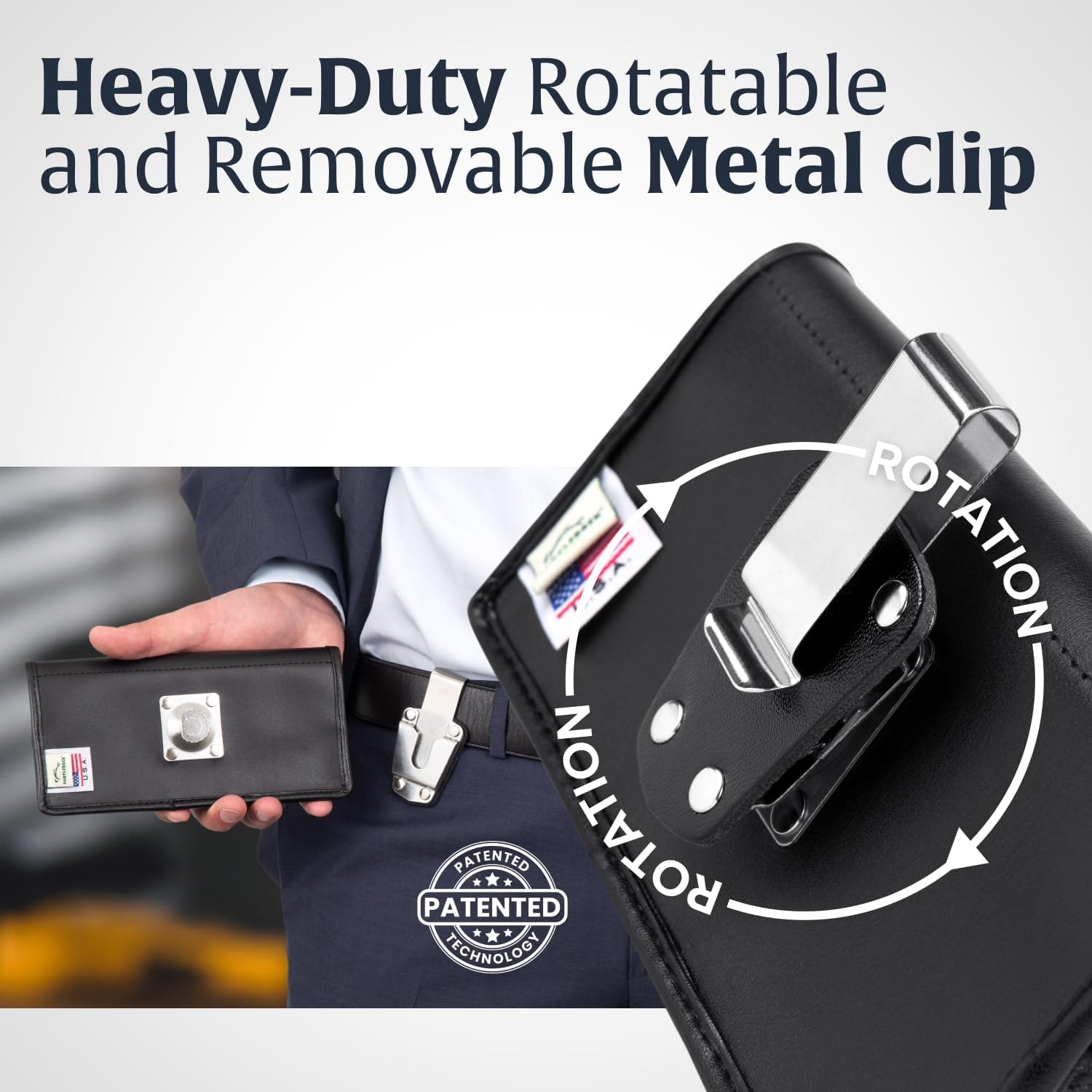- PATENTED HEAVY-DUTY BELT CLIP: This phone belt holder features a specially designed patented rotating rtcheting clip for a secure carry. The removable, rotatable clip locks with a D-ring mechanism, gripping tightly to your belt and keeping your phone holster secure while on the move. A durable choice in cell phone cases & covers, this stylish iPhone belt holder for men is a secure carry solution for everyday use.
