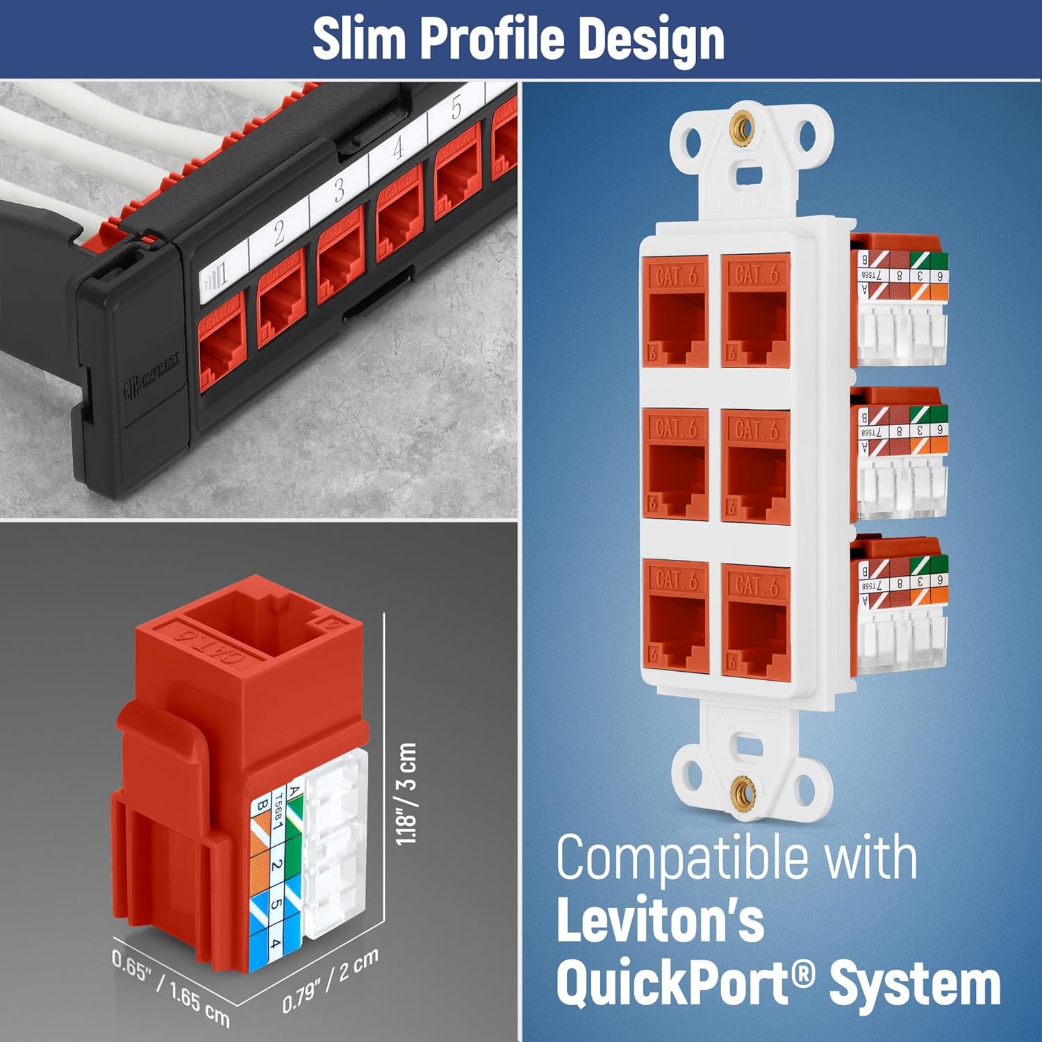 - Slim Profile Design - Can be used with a Keystone patch panel, wall plate, or surface mount box with standard or slim keystone blank openings. compatible with Leviton QuickPort System and slim Decora style wall plates
