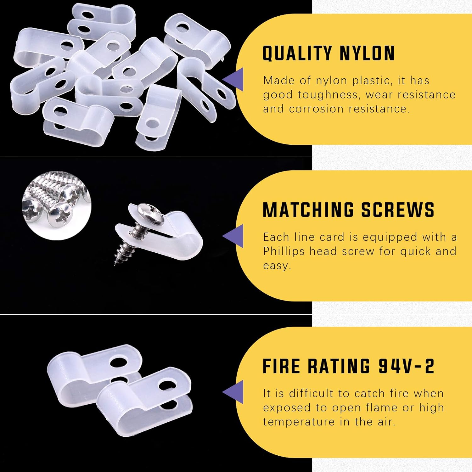 - ❤【Diverse size】--- Suitable for most common size wires,There are 7 types of wire selectable sizes: 6.4mm(1/4"), 8.4mm(5/16"), 10.4mm(3/8"), 13.2mm(1/2"),16mm(5/8"),19mm(3/4"), 23mm(1"),You can choose any size you need.In this kit, You will get 120 Pack White 1/4" Nylon Plastic R-Type Cable Clips Clamp with 120Pcs Screws.