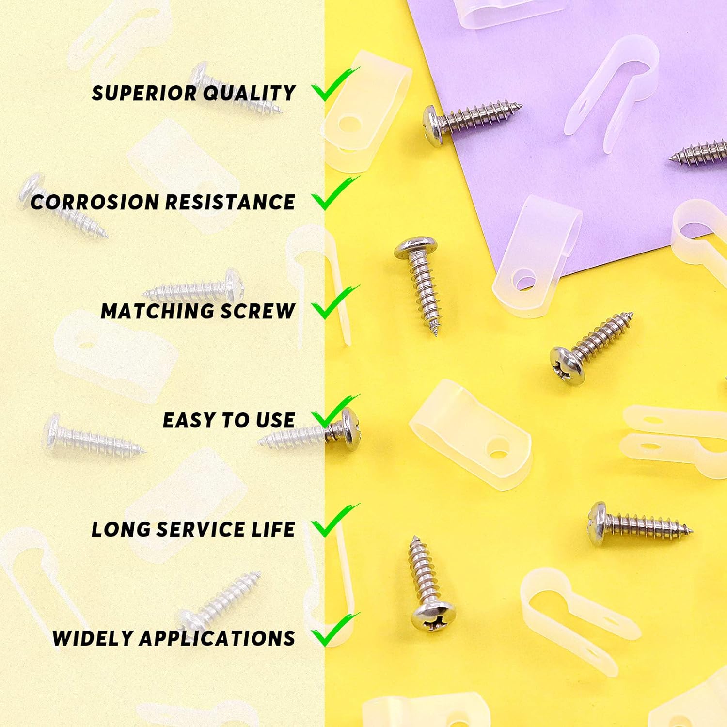 - ❤【 Equipped With Screws 】 --- In This Kit, You will get 60 Pack Nylon Plastic R-Type Cable Clamp Clips Assortment Kit, 6.4mm(1/4''), 8.4mm(5/16''), 10.4mm (3/8''), 13.2mm(1/2''), 19mm(3/4''), 23mm(1'') Nylon Clips with 135 Pack Screws for Wire Management. Screw size: Diameter: 4.2 mm, Length: 14 mm.