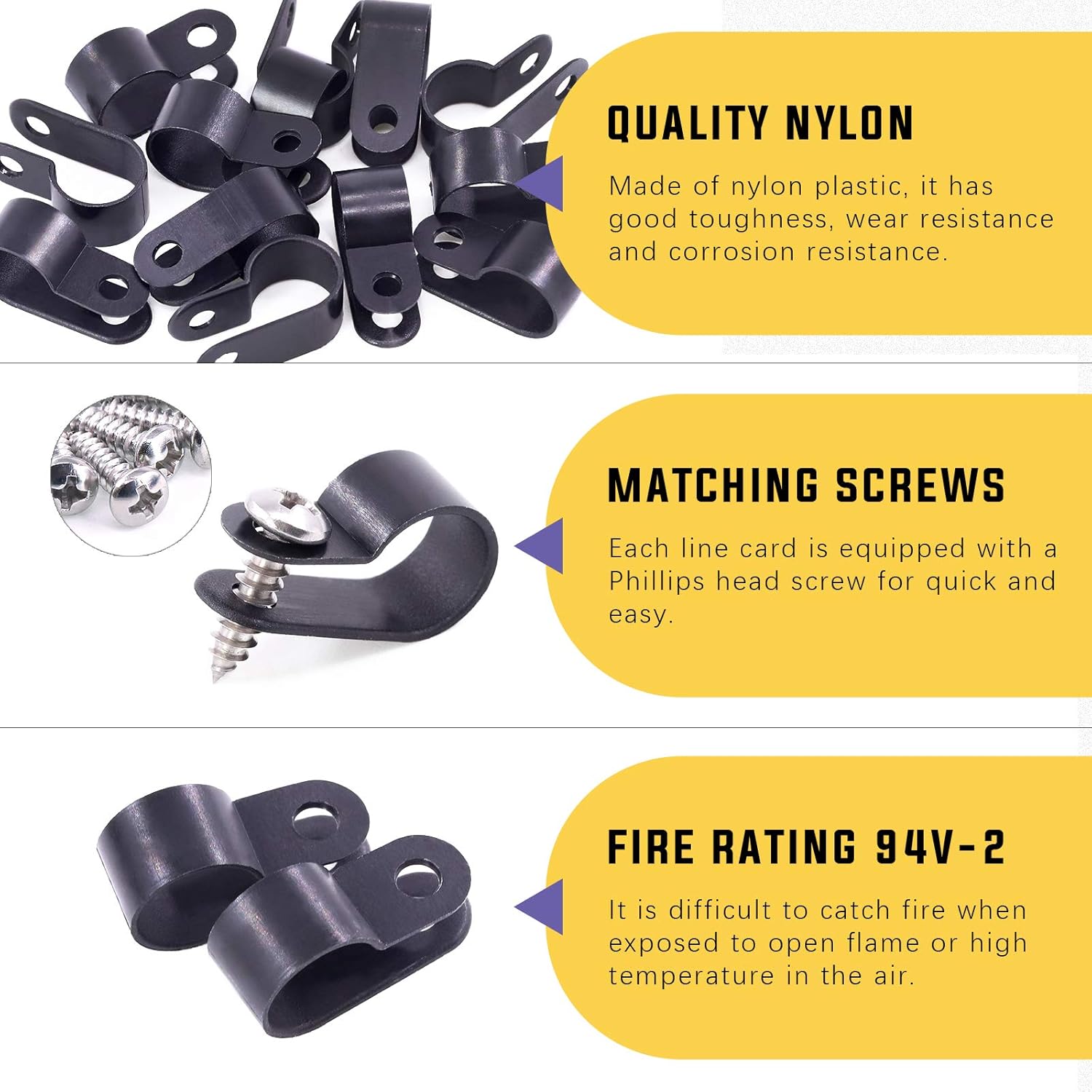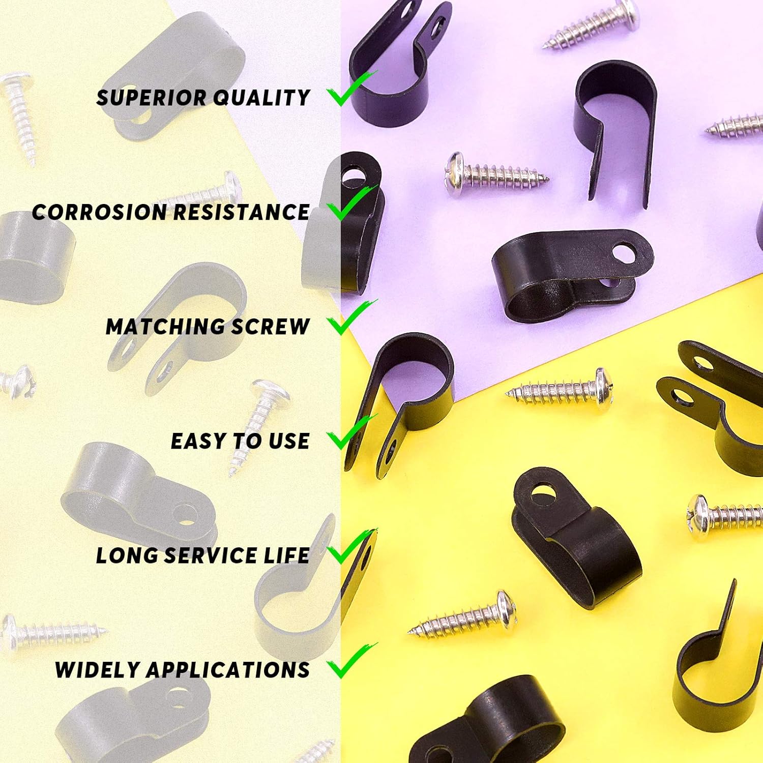 - ❤【 Equipped With Screws 】 --- In This Kit, You will get 120 Pack Nylon Plastic R-Type Cable Clamp Clips with 120Pcs Screws Assortment Kit, 6.4mm(1/4''), 8.4mm(5/16''), 10.4mm (3/8''), 13.2mm(1/2''), 19mm(3/4''), 23mm(1'') Nylon Clips with Screws for Wire Management. Screw size: Diameter: 4.2 mm, Length: 14 mm.