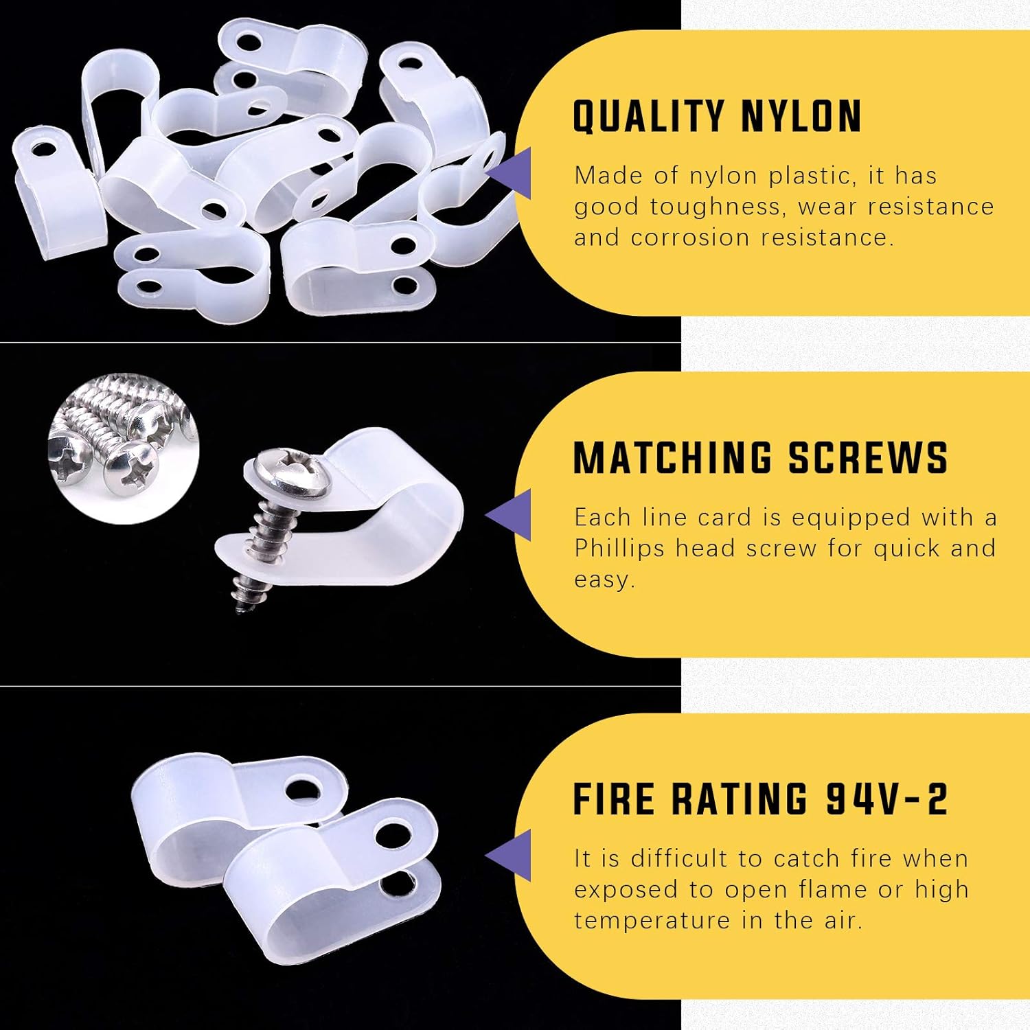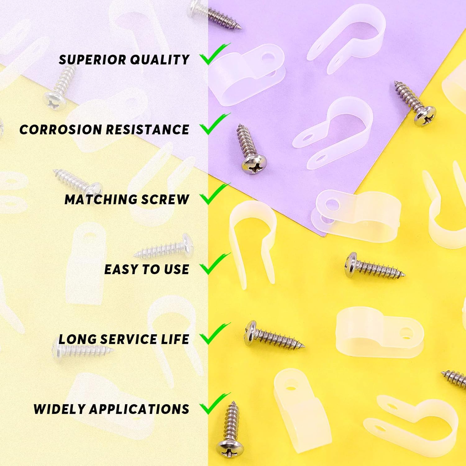 - ❤【Diverse size】--- Suitable for most common size wires,There are 7 types of wire selectable sizes: 6.4mm(1/4"), 8.4mm(5/16"), 10.4mm(3/8"), 13.2mm(1/2"),16mm(5/8"),19mm(3/4"), 23mm(1"),You can choose any size you need.In this kit, You will get 120 Pack White 1/4" Nylon Plastic R-Type Cable Clips Clamp with 120Pcs Screws.