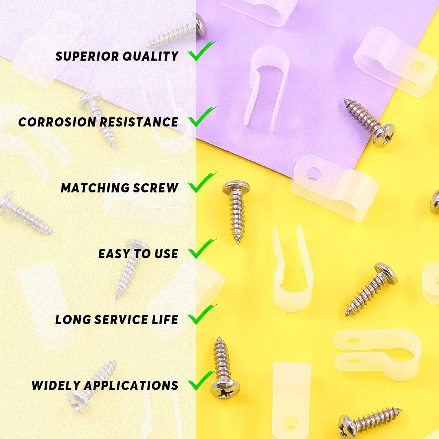 - ❤【 Equipped With Screws 】 --- In This Kit, You will get 120 Pack Nylon Plastic R-Type Cable Clamp Clips Assortment Kit, 6.4mm(1/4''), 8.4mm(5/16''), 10.4mm (3/8''), 13.2mm(1/2''), 19mm(3/4''), 23mm(1'') Nylon Clips with 120 Pack Screws for Wire Management. Screw size: Diameter: 4.2 mm, Length: 14 mm.