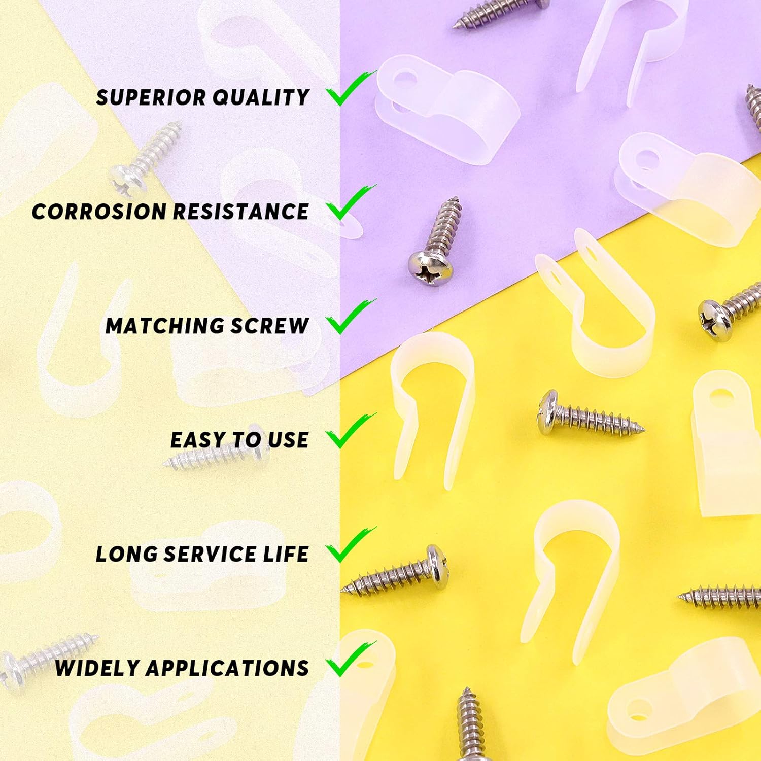 - ❤【 Equipped With Screws 】 --- In This Kit, You will get 120 Pack Nylon Plastic R-Type Cable Clamp Clips Assortment Kit, 6.4mm(1/4''), 8.4mm(5/16''), 10.4mm (3/8''), 13.2mm(1/2''), 19mm(3/4''), 23mm(1'') Nylon Clips with 120 Pack Screws for Wire Management. Screw size: Diameter: 4.2 mm, Length: 14 mm.