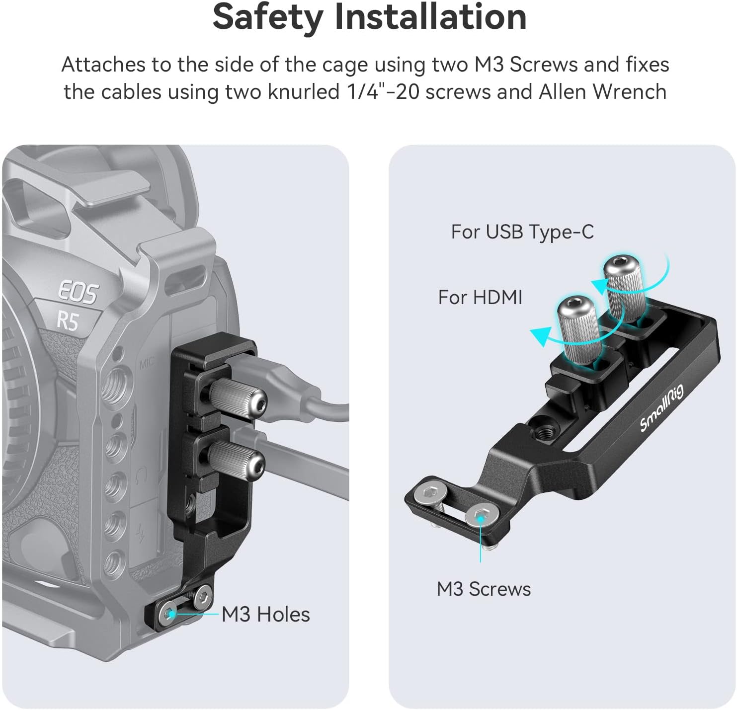 - 【Prevents Cable Disconnects】Designed for Canon R5 / R6 / R5 C Cage 2982 / 3464 and R6 Mark II Camera Cage 4159 to prevent the camera's cables for HDMI and USB Type-C from accidentally disconnecting