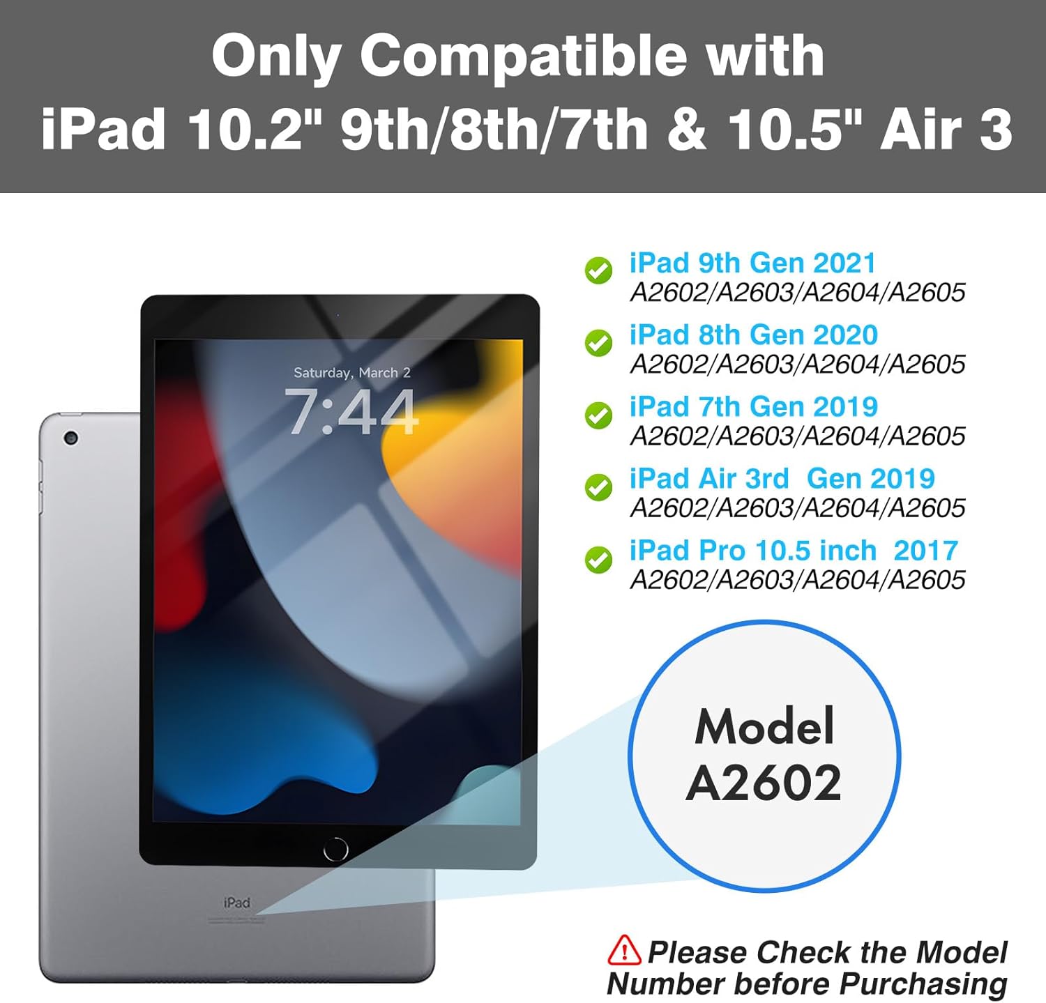 - ⌨️【Compatibility】Only for the following models: ✅iPad 9th Generation Case with Keyboard 10.2'' 2021: A2602, A2603, A2604, A2605; ✅iPad 8th Generation Case with Keyboard 2020: A2430, A2270, A2428, A2429; ✅iPad 7th Generation Case with Keyboard 2019: A2197, A2198, A2200; ✅iPad Pro 10.5 inch case with keyboard: A1701, A1709, A1852; ✅iPad Air 3rd Generation Case with Keyboard 2019: A2154, A2152, A2153, A2123; Please check the model number starting with "A" on the back of your iPad before purchasing