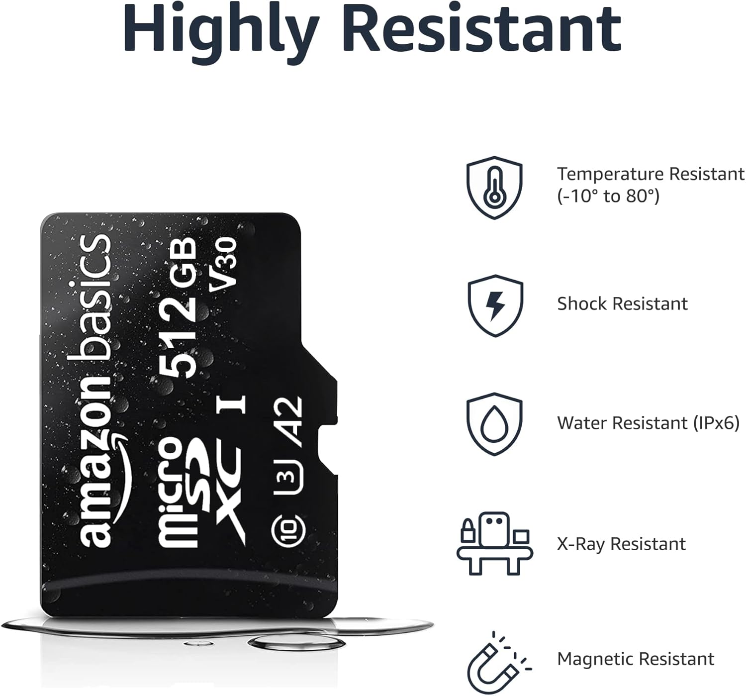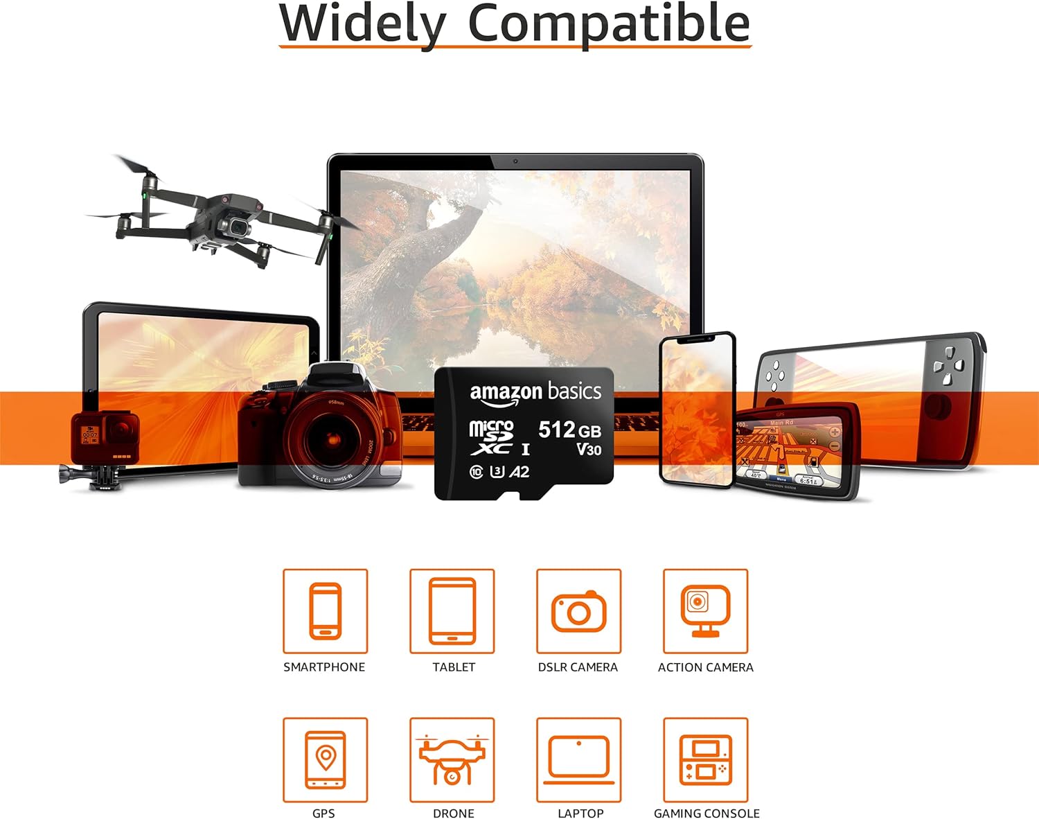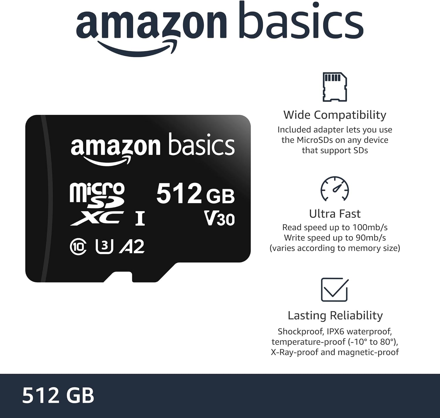 Amazon Basics Micro SDXC Memory Card with Full Size Adapter, A2, U3, Read Speed up to 100 MB/s, 512 GB, Black