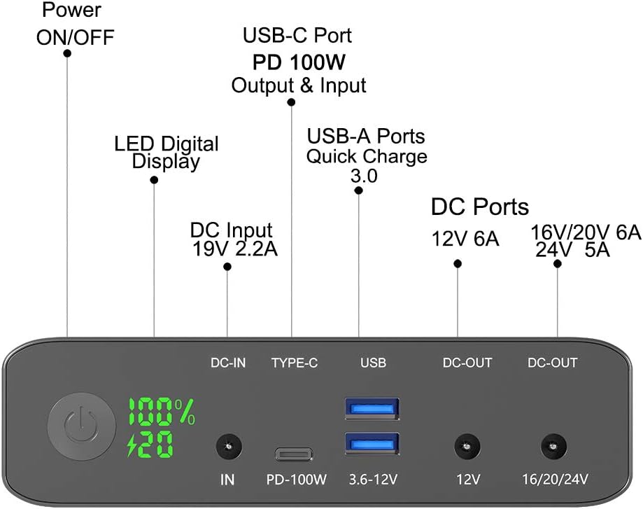 - 【Adjustable DC Output】Built in 2 DC output. One port supports 12V 6A; another supports 16V/20V 6A, 24V 5A. The battery bank can directly charge your laptop without needing your laptop charger.