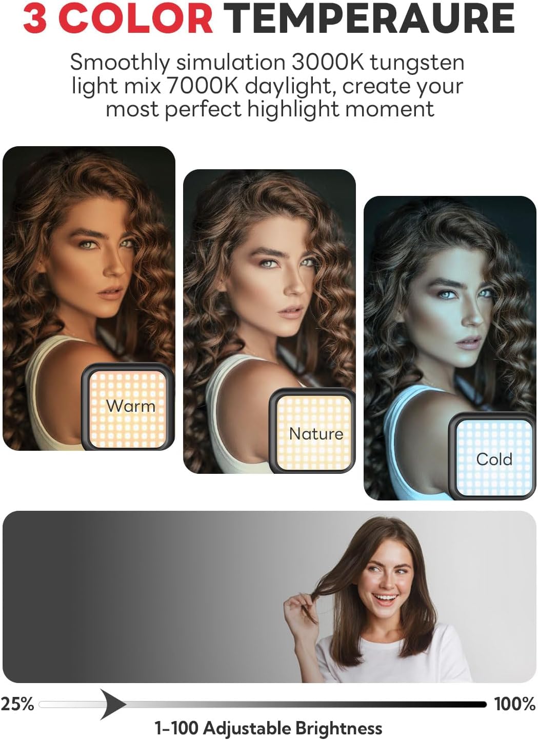 - Customized LED Lighting. Adjustable desktop tripod with universal phone mount, rechargeable LED light with 3-level brightness,3000K-6000K color temperature adjustable. The LED light can be easily mounted with its four cold-shoe threads for installing any 1/4” thread camera accessories upon the LED light.