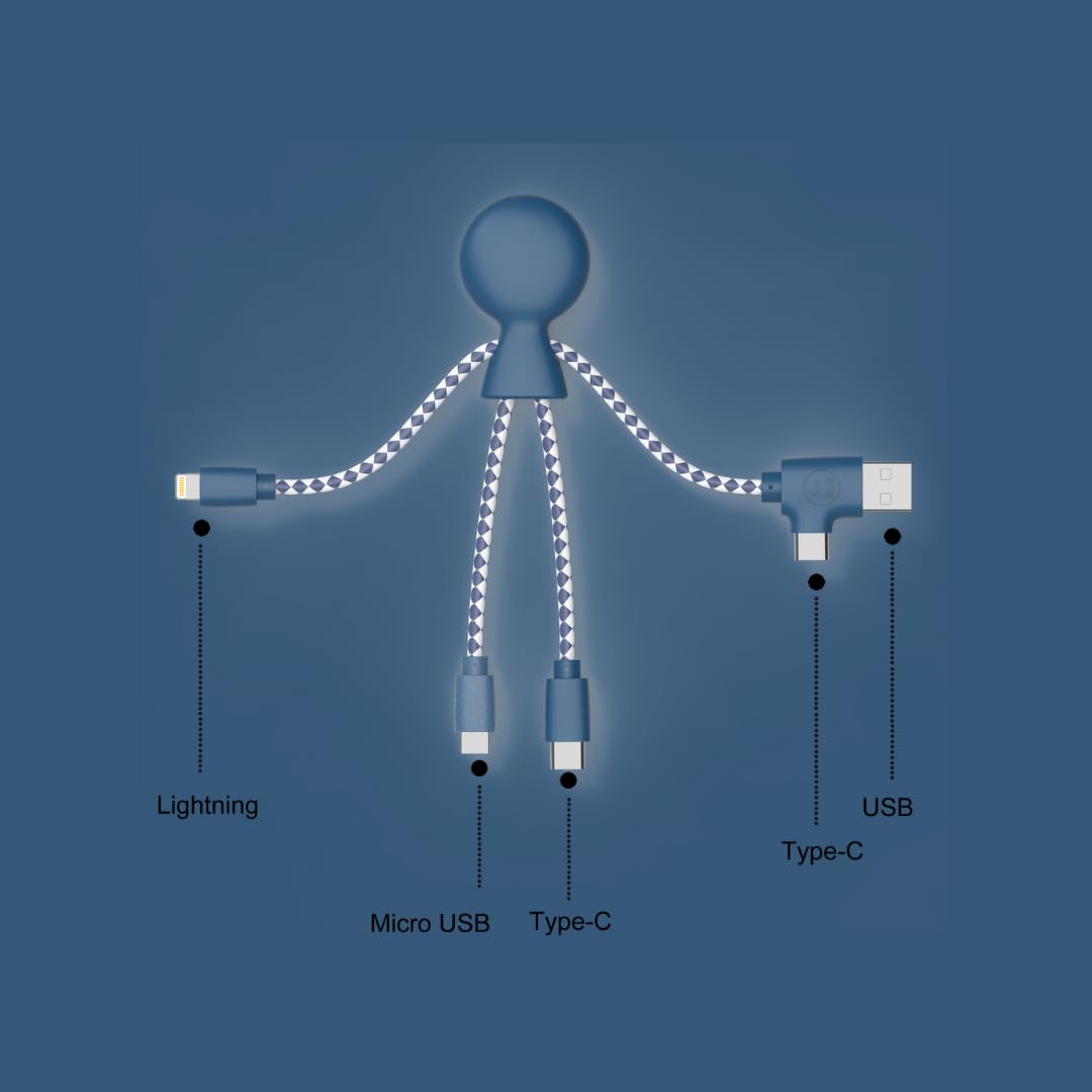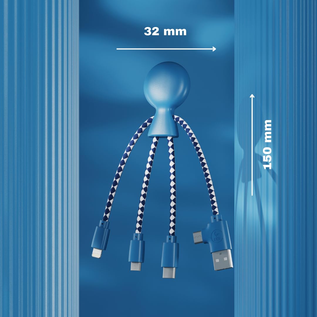 Multi USB Cable 4 in 1 - Universal Charger Made from Recycled Plastic - USB, USB-C, Lighting, Micro USB Ports - Compatible with All Smartphones Mr Bio Blue Octopus