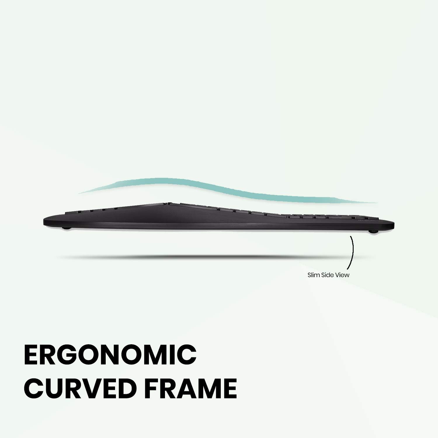 - SLIM DESIGN - Curved key top geometry with a naturally arched shape and integrated adjustable palm rest stand that promotes a neutral wrist position on a slim design with low profile keys; A height of 1.5" (39 mm)