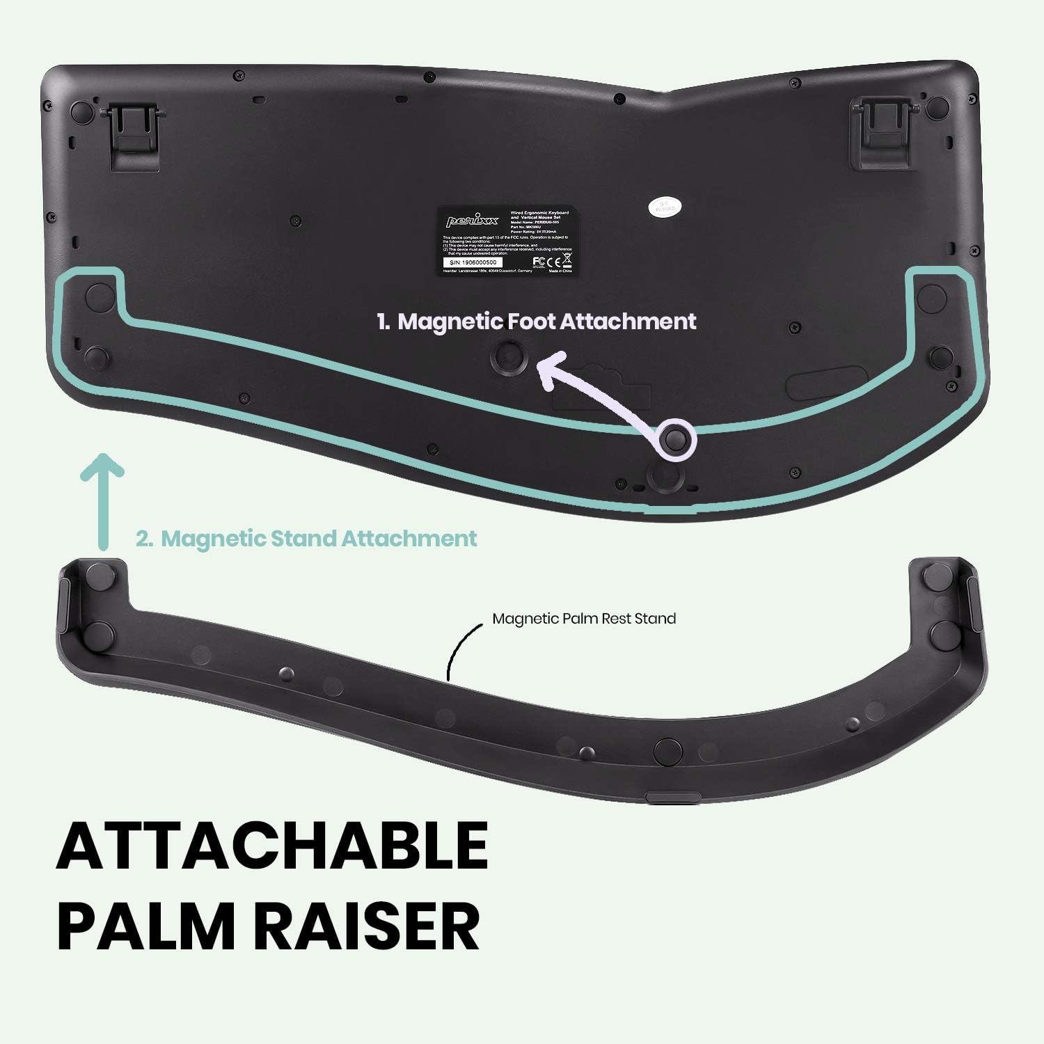 - ERGONOMIC SPLIT KEY DESIGN - A full-size keyboard with a curved design that separates the keys into several clusters to optimize the placement of the left and right hand to reduce bending your wrist outwards while typing; PERIBOARD-330 is a set of keyboard and an attachable wrist rest raiser with magnet technology to adjust to three different typing angles for a relaxed and personalized typing experience; Featuring 12 multimedia and hotkey functions