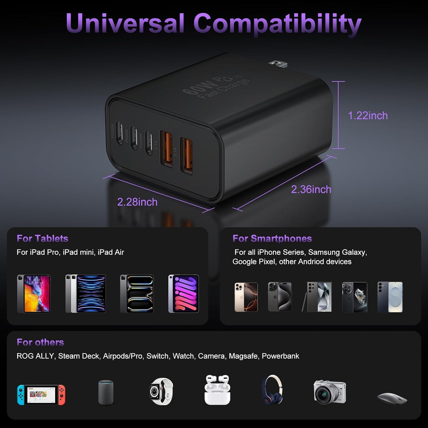 - 5-IN-1 High Speed Charging Cube for Multi Devices: with 3 USB-C ports and 2 USB-A ports, the newest wall charger brick can fast charge 5 devices simultaneously for efficient power distribution, such as phones, tablets, cameras, power banks, headphones, smartwatches, Swtich etc. One for all, save your outlet space instead of occupying 5 wall sockets. It is the best replacement for your original USB chargers