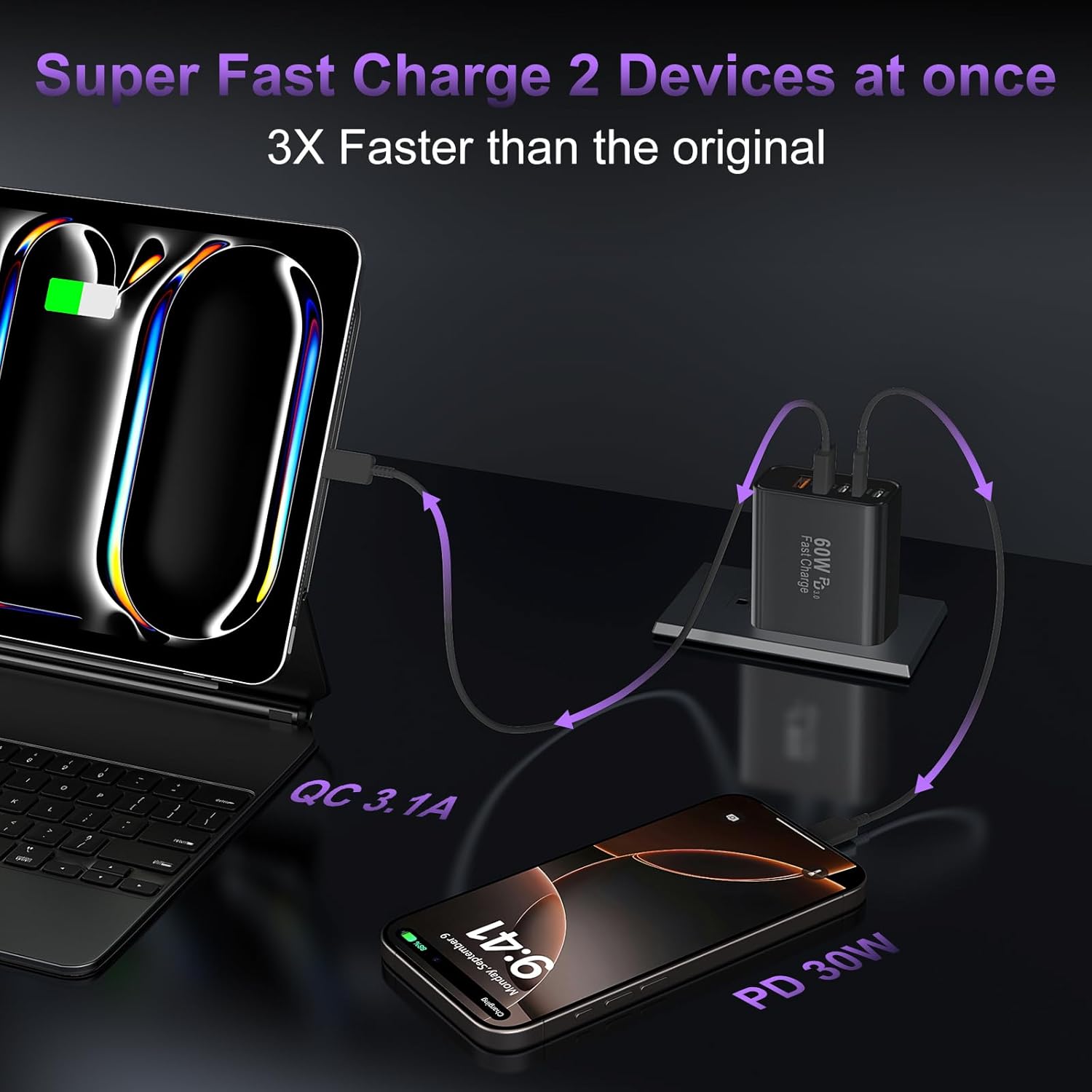 - 2-Pack 60W USB C Charger Fast Charging Blocks: Auorld 60W USB C Fast Charging Blocks support the Power Delivery and Quick Charge 3.0 fast charging functions with a total power of up to 60W. The USB-A port offers an output power of 3.1 A/5 V, while each USB-C port provides Max 30W output power, charge your Phone 16 15 Pro Max up to 65% in just 30mins, 10% faster than the original 20W USB C charger