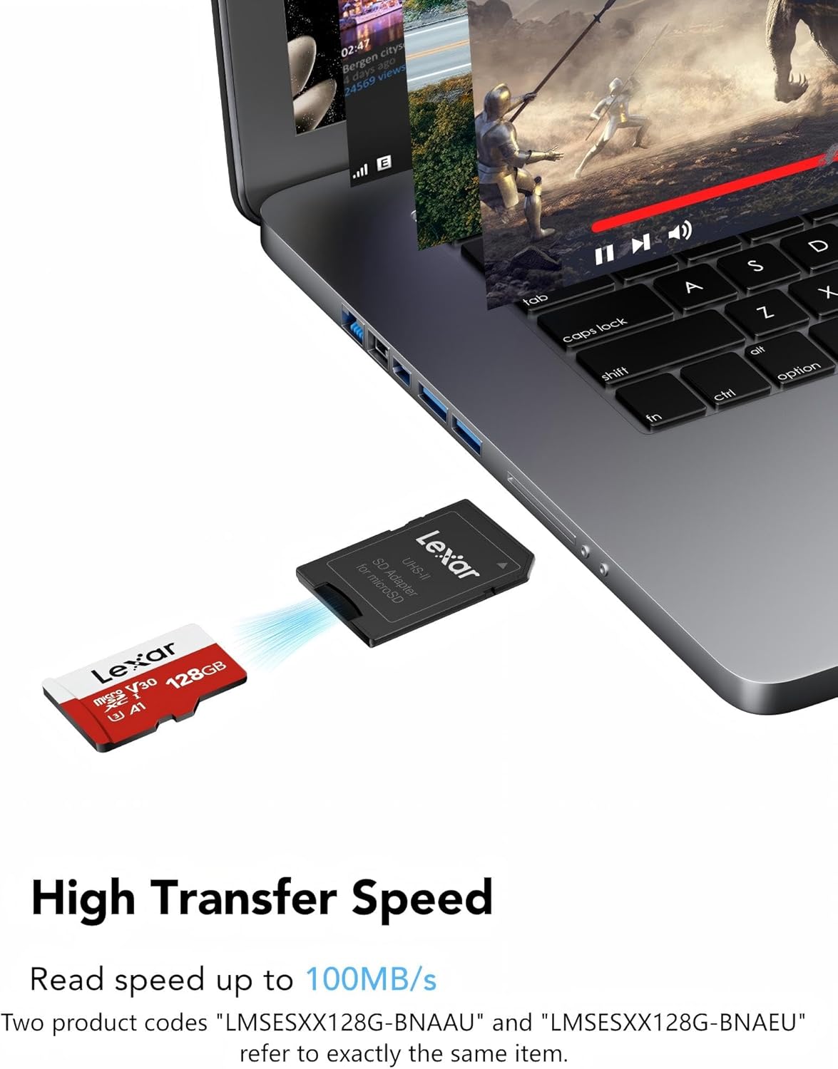 - Lexar 128GB Micro SD Card supports up to 100MB/s read speed and up to 30MB/s write speed for data transfer. (Based on internal test environment of Lexar, so the actual speed may vary with different host devices and environments. For devices that don't support UHS-I, the transmission speed will be different due to interface limitations.)