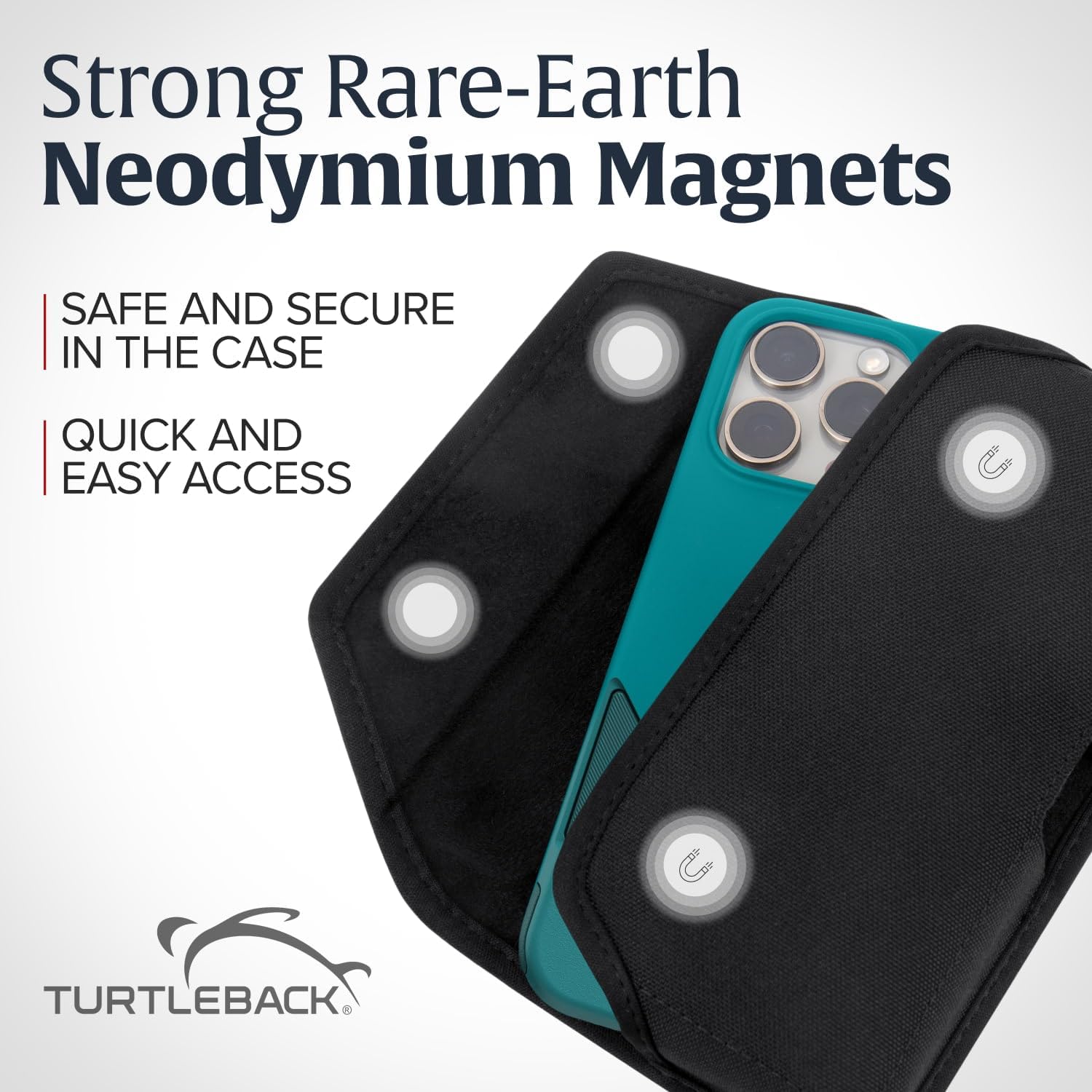 - DESIGNED AND BUILT IN THE USA: The Turtleback premium phone holster is crafted from high-quality reinforced nylon, laminated with a proprietary durable backing material to provide superior resistance against dirt and water. Built for strength and style, this iPhone belt holder for men combines long-lasting durability with aesthetic appeal and an improved tactile feel. This phone holster fits horizontally on your belt and features a secure, rotating ratcheting belt clip for reliable everyday carry. Whether you prefer a rugged nylon holster or a sleek leather phone case, Turtleback delivers reliability and craftsmanship you can trust. Proudly Designed and Built in the USA since 2001.
