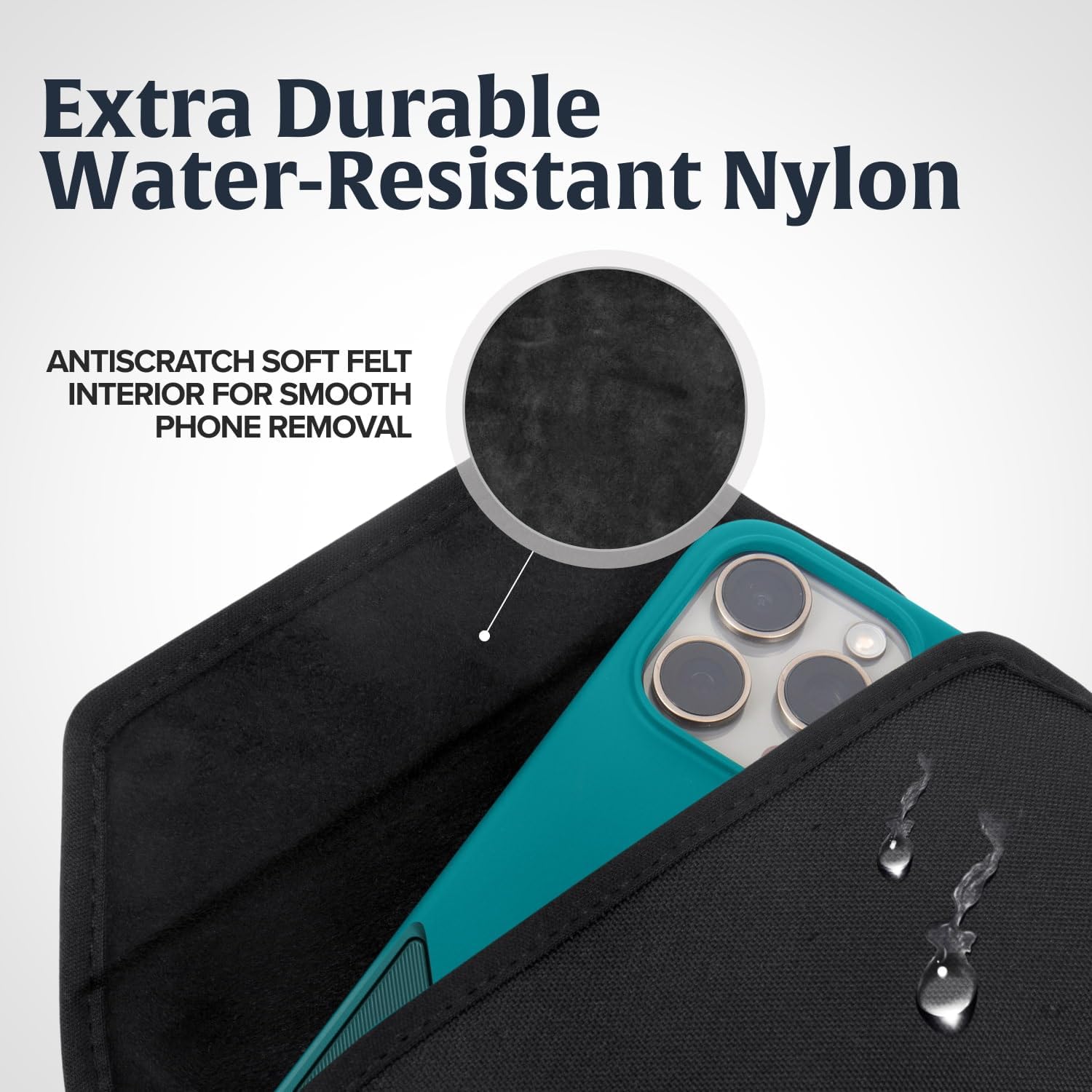 - SPECIALLY DESIGNED FOR IPHONES: This premium phone belt holder fits iPhone 16e/16 Pro, 15/15 Pro, 14/14 Pro, 13/13 Pro, and 12/12 Pro. It accommodates iPhones with a Shockproof Commuter Style or Size Case. With interior dimensions of 6.05 x 3.12 x 0.60 inches, this stylish iPhone belt holder is a durable cell phone pouch and reliable men's belt clip.