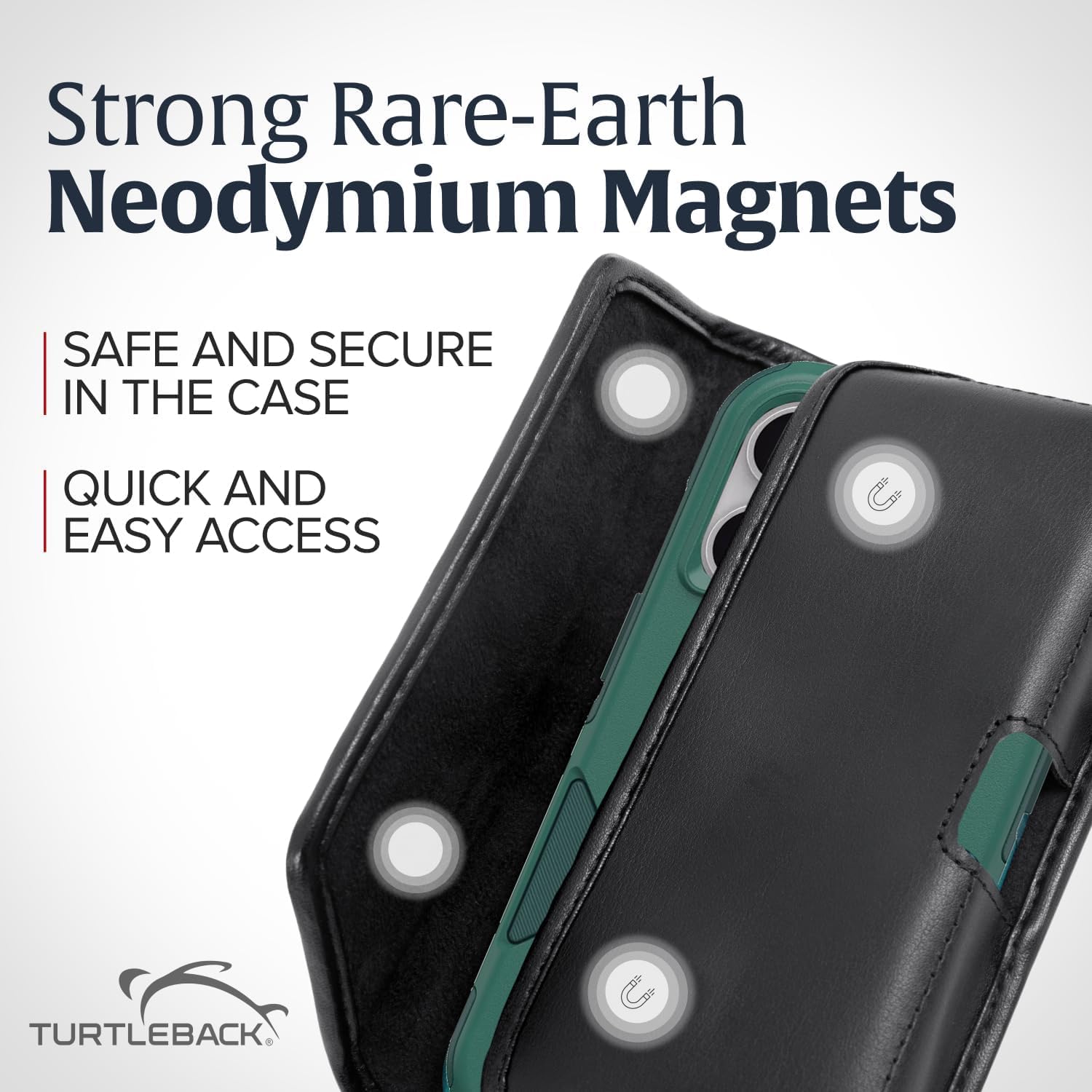 Turtleback Belt Clip for iPhone 16 Pro Max, 15 Pro Max, 14 Pro Max -Medium- Fits w/Shockproof Commuter Style Cases, Premium Black Leather, Horiz. Belt Holder, Magnetic Closure HD Rotating Clip