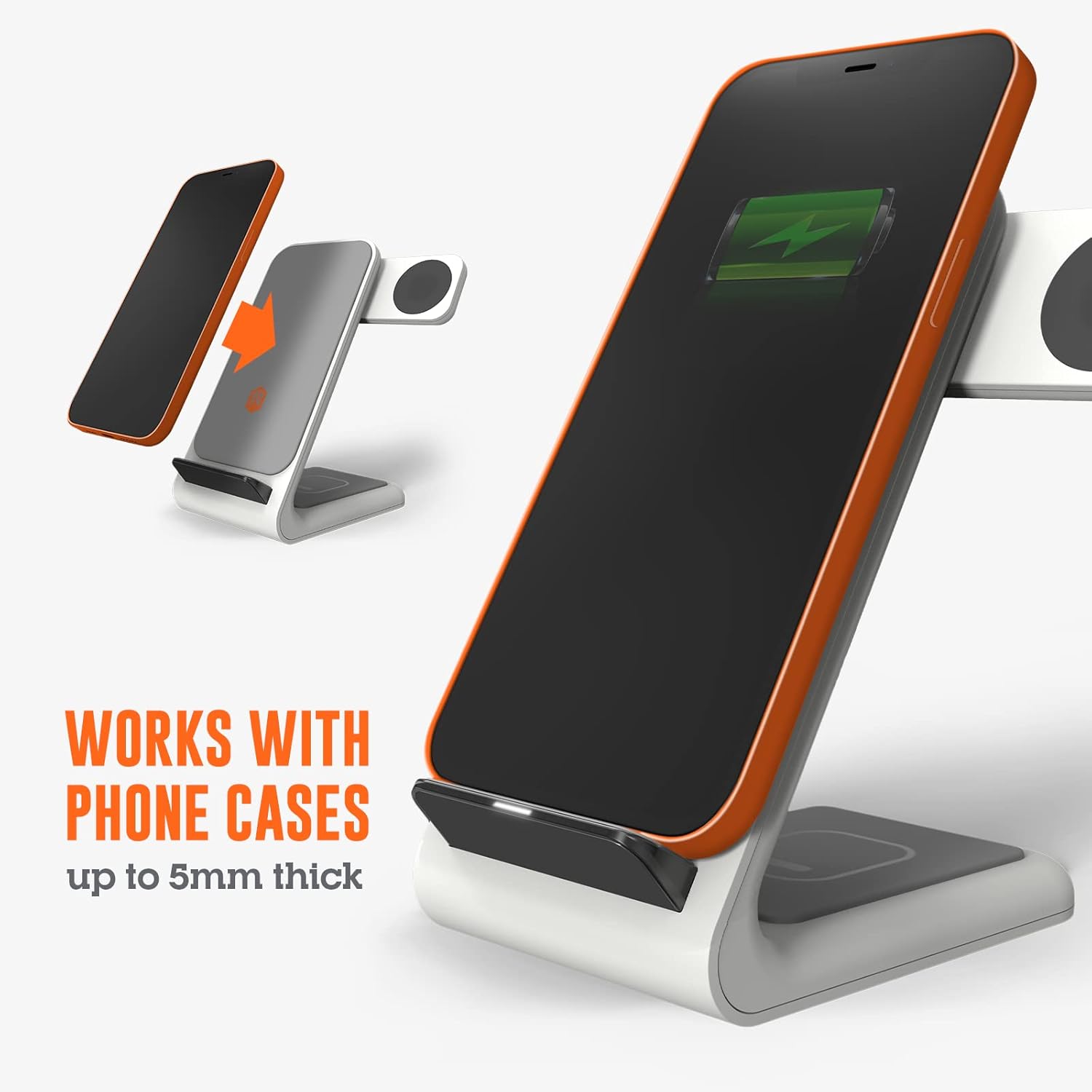 - Compatible with AirPods in wireless charging cases and non-metal phone cases up to 5mm thick, allowing you to charge without removing the case.