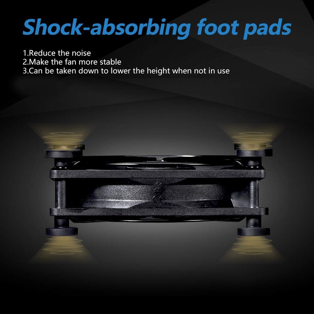 - Fan spliced size 9.64” X 4.92” X 1.81”. Shockproof foot pads can make the fan lay flat or upright.