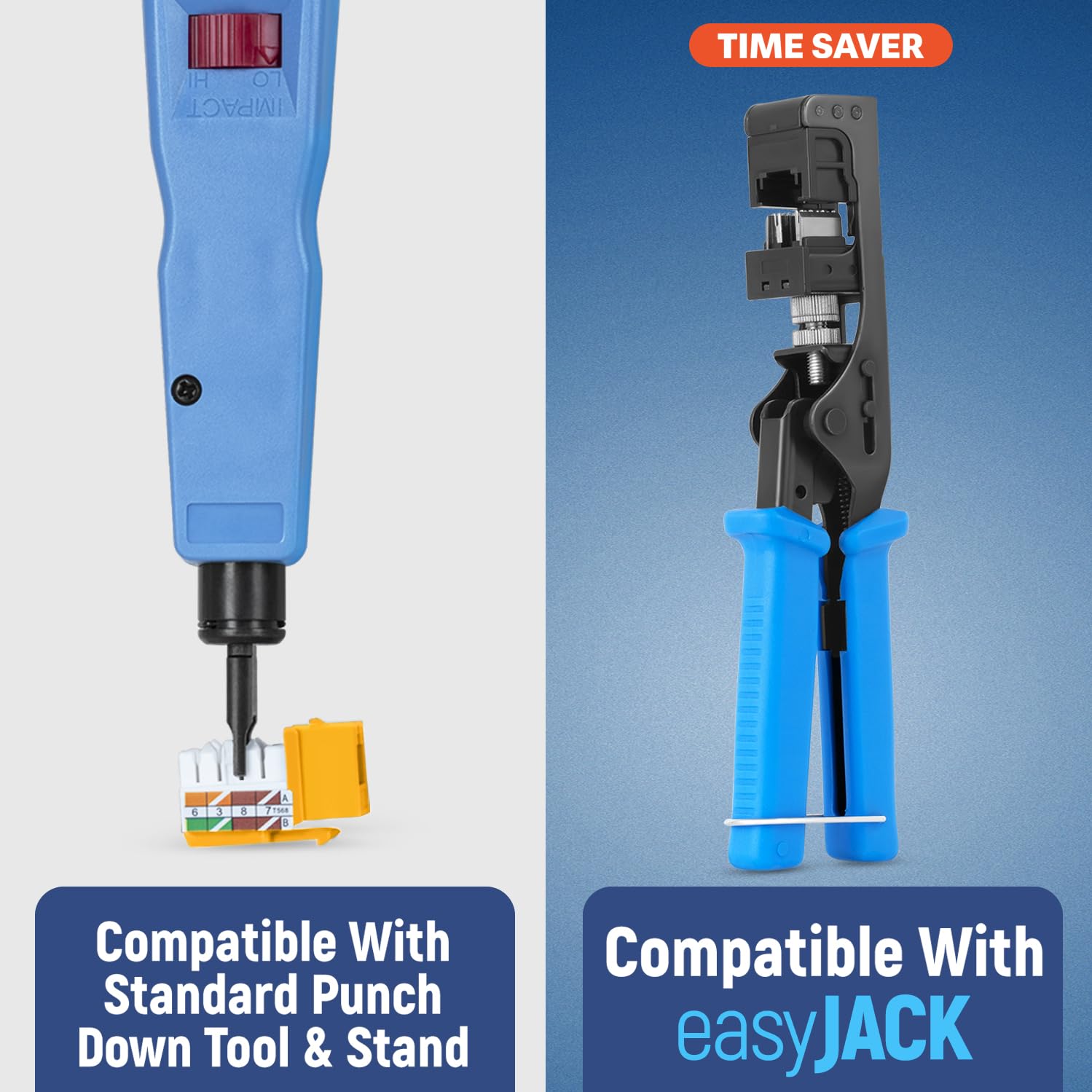 - Compatibility - compatible with our 90 degree angled speed termination tool - easyJACK (B094WB91H3). These cat 6a jacks keystone rj45 can also work in conjunction with a standard punch down tool and punch down stand for convenience.