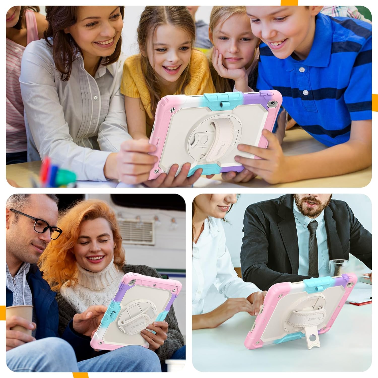 - MULTI-ANGLE FUNCTIONALITY: 360° rotating stand with 5 positions for video calls, notes, or viewing; Detachable shoulder strap for commutes; Anti-slip hand strap secures during outdoor work; Dedicated pencil holder for hiking/transport