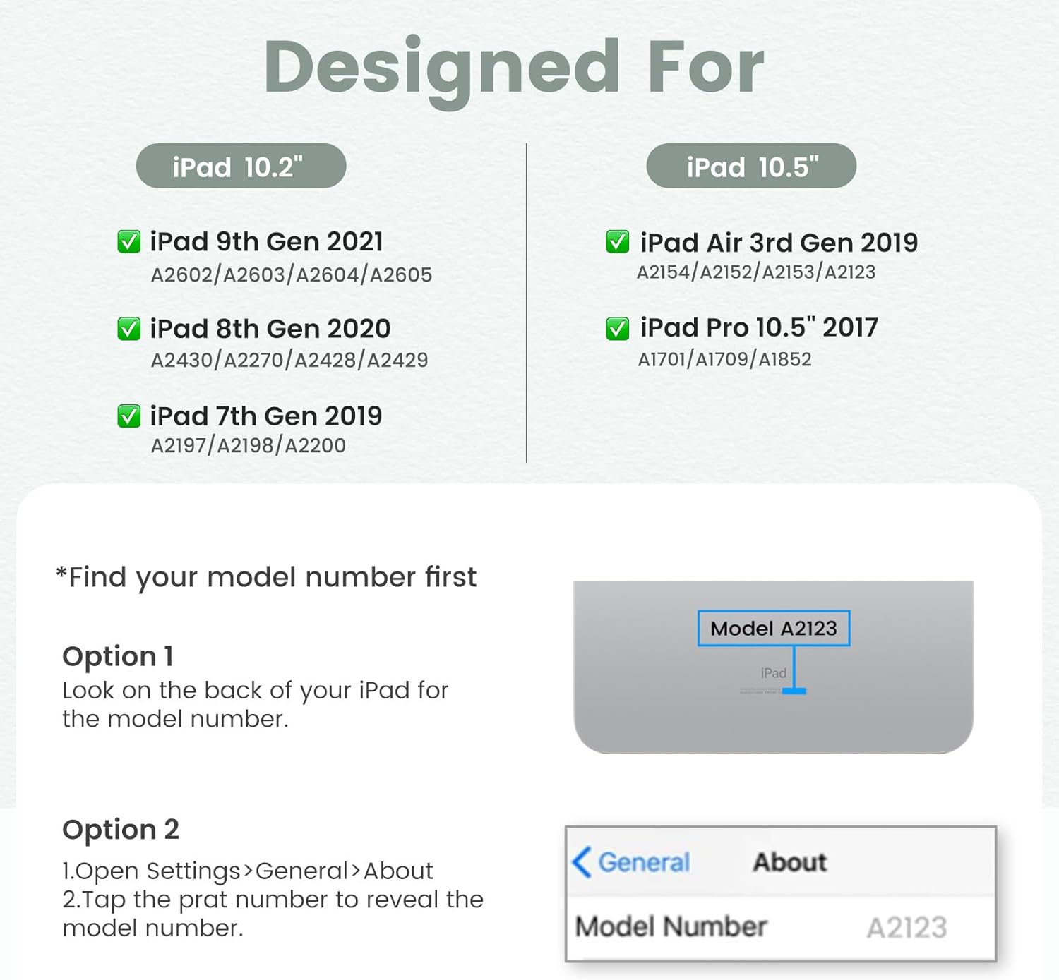 - ✅【IPad 7th/8th/9th Generation Case with Keyboard Compatibility】Our iPad keyboard case is designed for new iPad 9th 2021 (Model number:A2602/ A2603/ A2604/ A2605),iPad 8th 2020 released (A2430/A2270/ A2428/ A2429), iPad 7th Generation 10.2 inch 2019 released (A2197/A2198/A2200), iPad Air 3rd Gen 10.5-inch 2019 released (A2152/A2123/A2153/A2154) and iPad Pro 10.5-inch 2017 released (A1701/A1709/A1852).