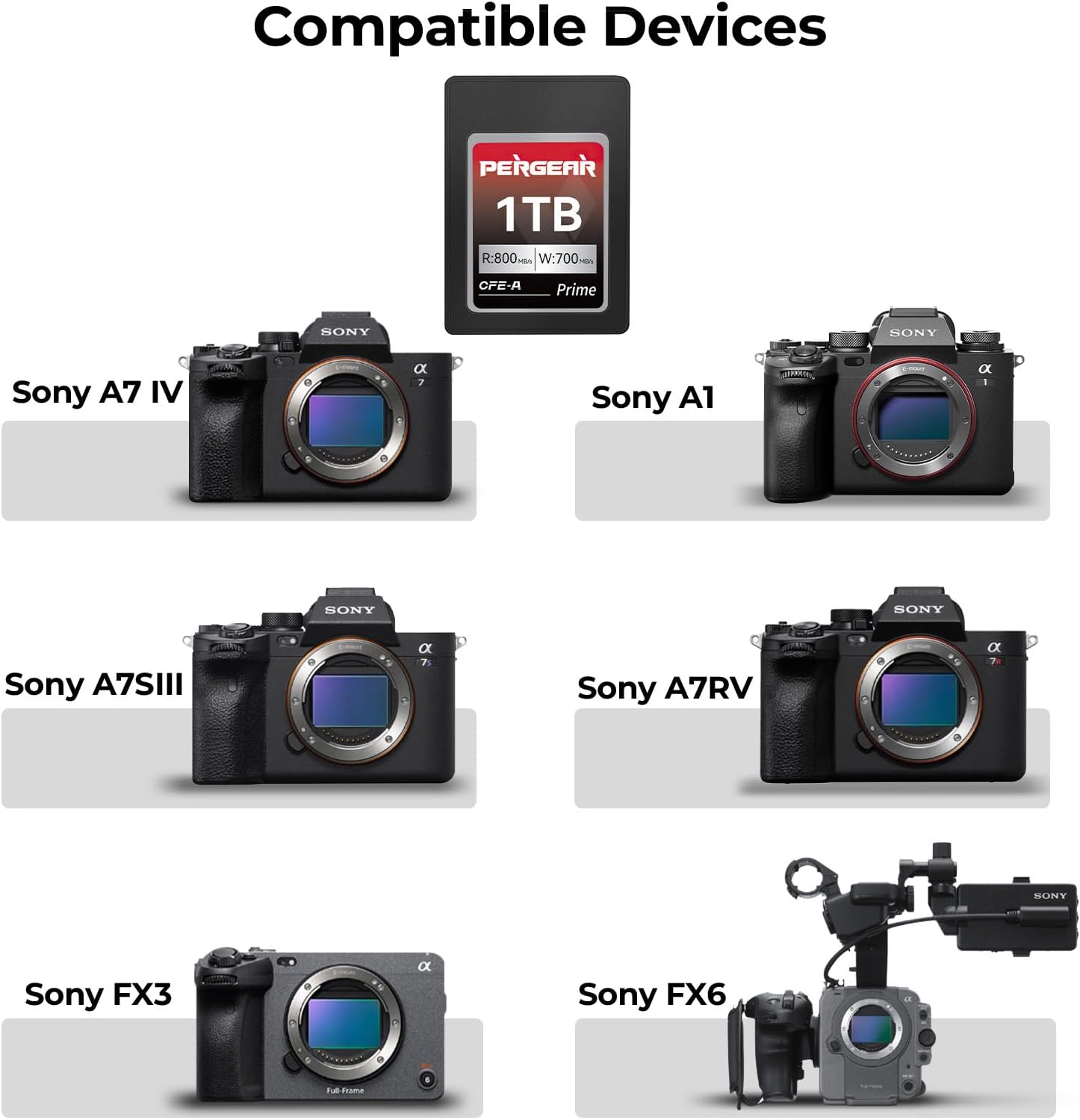 - đżăCompatible Sony Alpha & FX Camerasă Compatible Sony Alpha & FX Cameras: This 1TB CFexpress Type A card has been approved for the Sony A7 IVăA1ăA7SIIIăA7RVăFX3ăFX6.