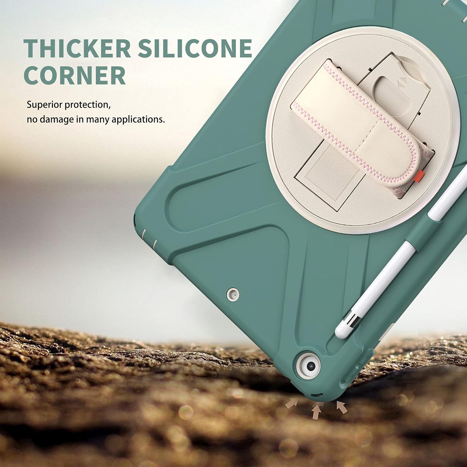 - FEATURES: ①Built-in Kickstand is 360 degree rotating, you can adjust your 10.2 inch iPad to whatever angle you want, perfect for watching videos and chatting; ②Built-in elastic Pencil Holder makes it easy to pull out and store your Apple pencil store your Apple Pencil ③Adjustable velcor hand strap allows big hand and small hand, perfect for kids and adults. ④Adjustable and detachable Shoulder belt is very convenience, safe and fashion you can carry tablet with should belt wherever you want