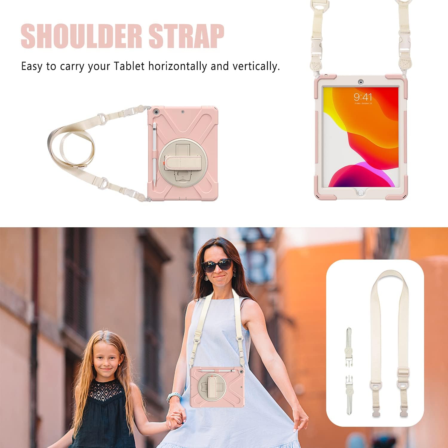 - FEATURES: ①Built-in Kickstand is 360 degree rotating, you can adjust your 10.2 inch iPad to whatever angle you want, perfect for watching videos and chatting; ②Built-in elastic Pencil Holder makes it easy to pull out and store your Apple pencil store your Apple Pencil ③Adjustable velcor hand strap allows big hand and small hand, perfect for kids and adults. ④Adjustable and detachable Shoulder belt is very convenience, safe and fashion you can carry tablet with should belt wherever you want