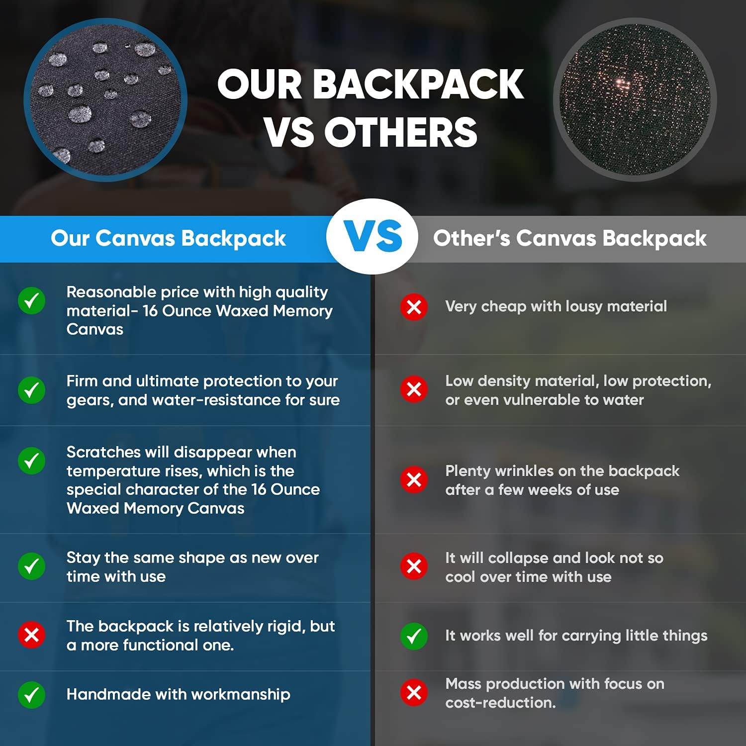 - Vintage Design. The camera backpack is made by waxed canvas and crazy horse leather, which is water-resistant, sturdiness and durable. Through wear and tear, it will show the changes in the shades of color and reflects the vintage look.
