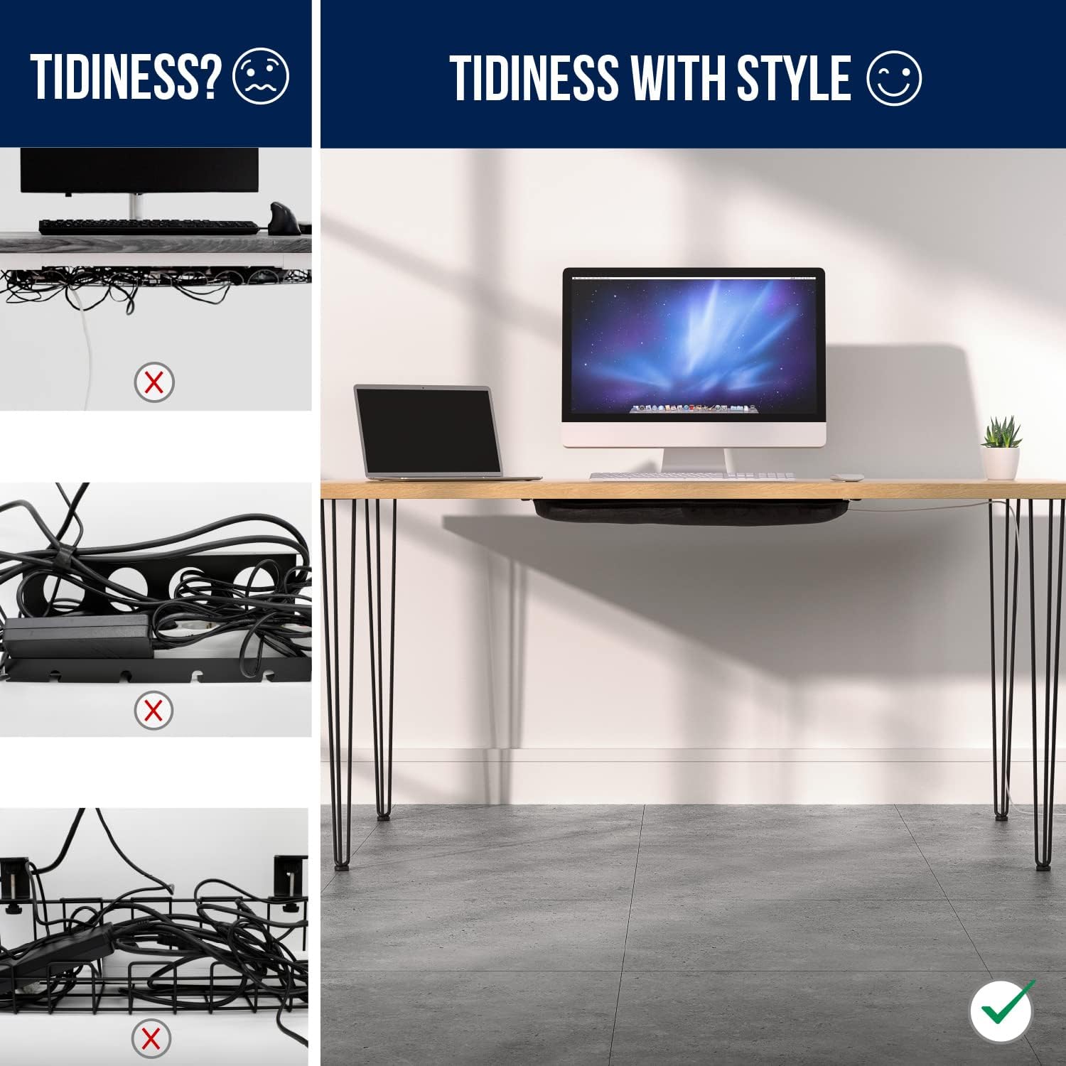 - Hide every cable! A flexible cable net under desk offers enough space to store all power supplies and plugs. Position the under desk cable management tray to sort all cables clips included and keep your cable tidy desk neat.