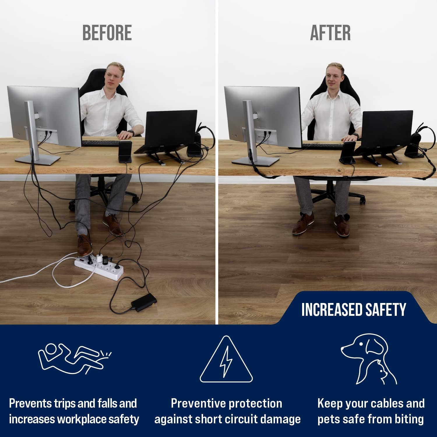 - Suitable for any desk! This cable net is universally compatible with every standard office desk. With this desk cable management, you keep your under desk cable tidy and its an under desk cable management solution for every kind of table.