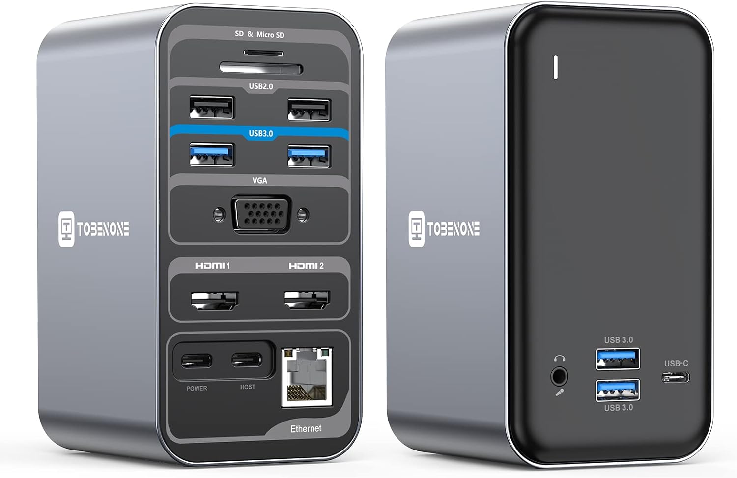 - 15-in-1 USB C docking station: With this TobenONE USB C docking station dual monitor you can easily extend your Windows laptop from one Type C/Thunderbolt 3/4 port into 15 ports, this dock is equipped with dual HDMI, VGA, 4×USB 3.0, and 1×USB C data transfer ports(5Gpbs), USB C PD 3.0, 2×USB 2.0 for wireless devices such as keyboard or mouse, 3.5mm Audio, SD/TF reader and RJ45 Gigabit Ethernet, which fully meet your needs in daily life