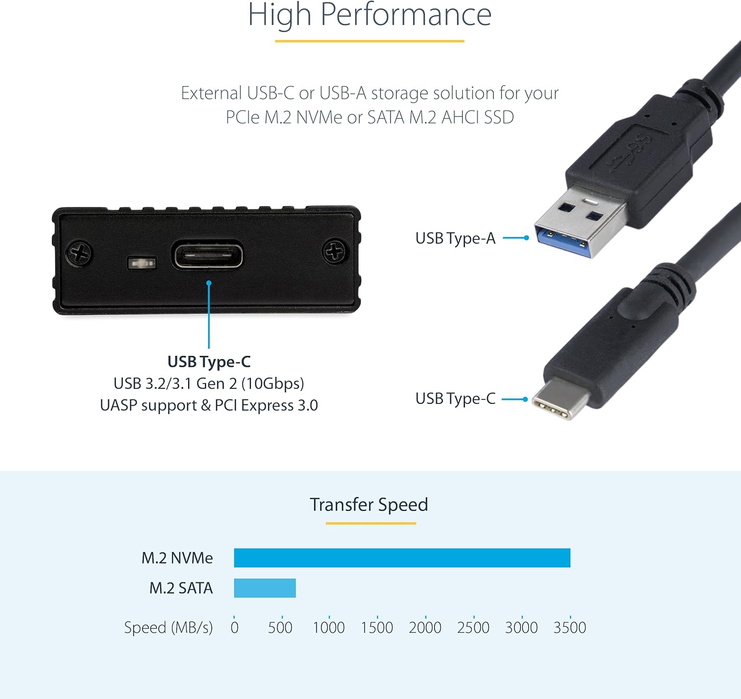 - HIGH PERFORMANCE: External USB-C or USB-A storage solution for your PCIe M.2 NVMe or SATA M.2 AHCI SSD; This enclosure features USB 3.2 Gen 2 (10Gbps) with UASP support & PCI Express 3.0; Backward compatible with USB 3.0/2.0