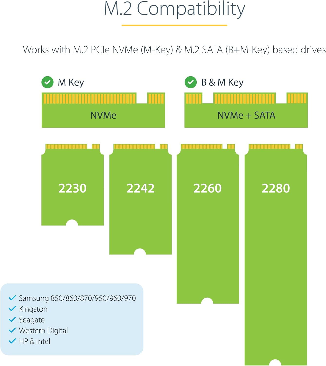- M.2 COMPATIBILITY: Works with M.2 PCIe NVMe (M-Key) & M.2 SATA (B+M-Key) based drives; Works with 2230/2242/2260/2280 SSDs including Samsung 850/860/870/950/960/970, Kingston, Seagate, Western Digital, HP, and Intel SSD drives; NOT COMPATIBLE W/22110mm
