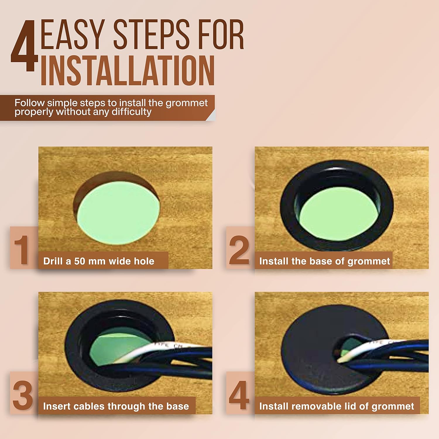 - Easy Installation:These 2 inch desk grommet are easy to install into 2 inch (50mm) hole in your desk. Simply trace outer diameter of cord hole cover to drill hole and push plastic grommet in it.