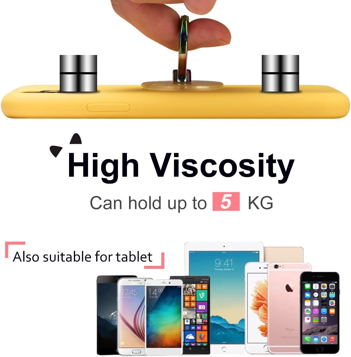 - 🐱High viscosity, strong sticky adhensive makes sure the ring be attached tightly to the back of your phone/tablet. The few sticky residue left after detaching can be wipe off by rubbing alcohol easily.