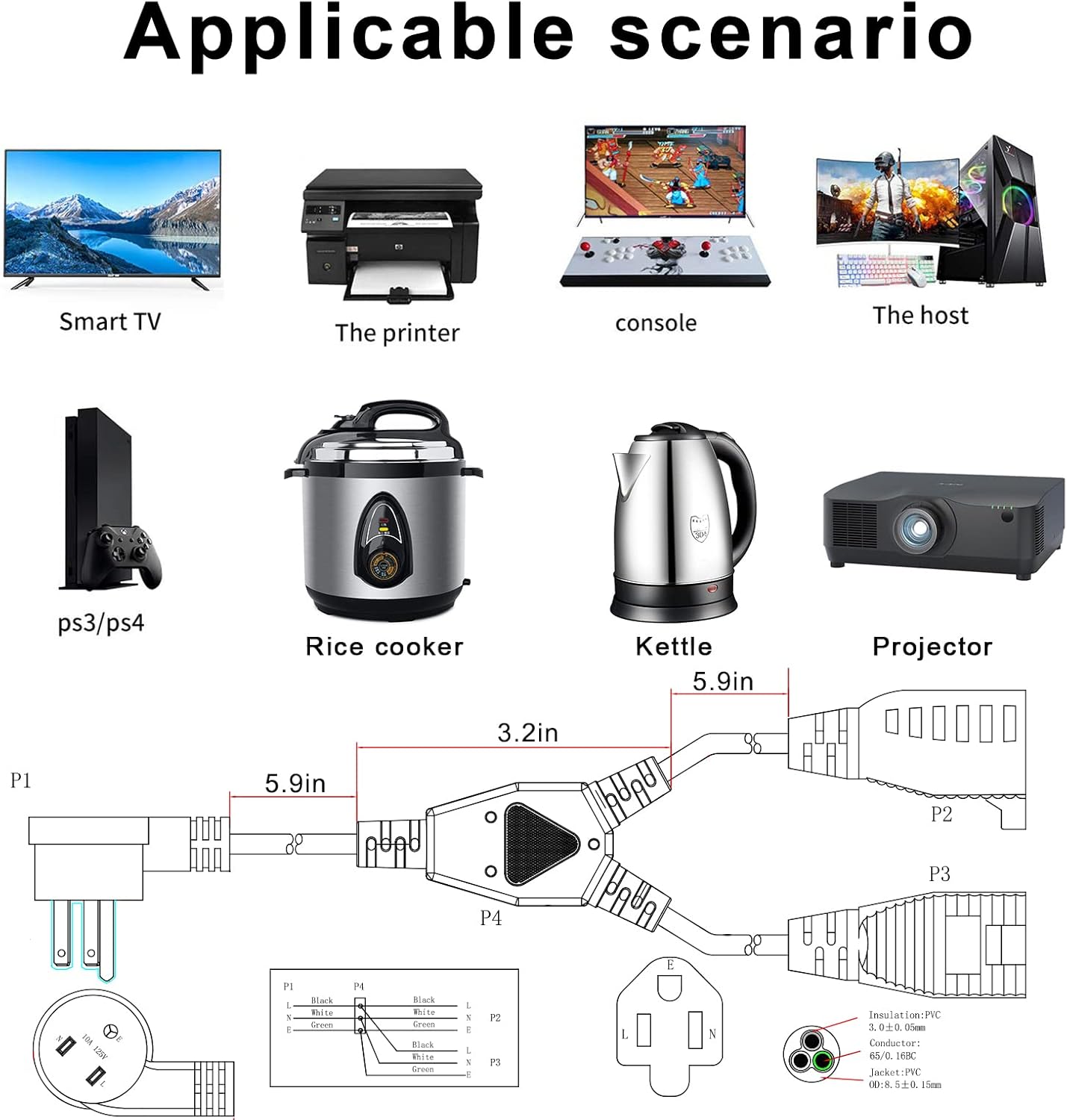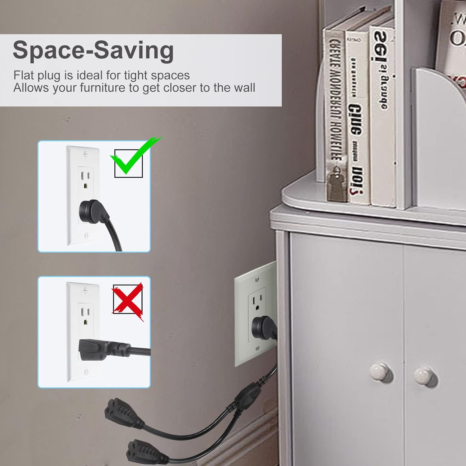 - 【Flat Plug】This Y Splitter extends your power cord and angles the plug off to the side so that it can sit flat against the wall and free up other outlets. Position your furniture close to the wall, maximize space on your power strip, surge protector, or wall outlet.