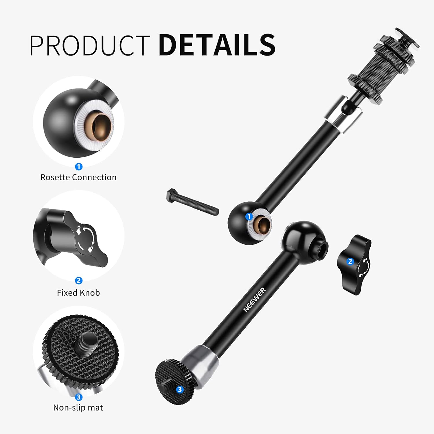 - 【Small & Lightweight】 11” magic arm (with cold shoe adapter) and the super clamp are lightweight and can be easily slip into a pocket for indoor and outdoor activities. The maximum load capacity of the magic arm is 4.4lb/2kg