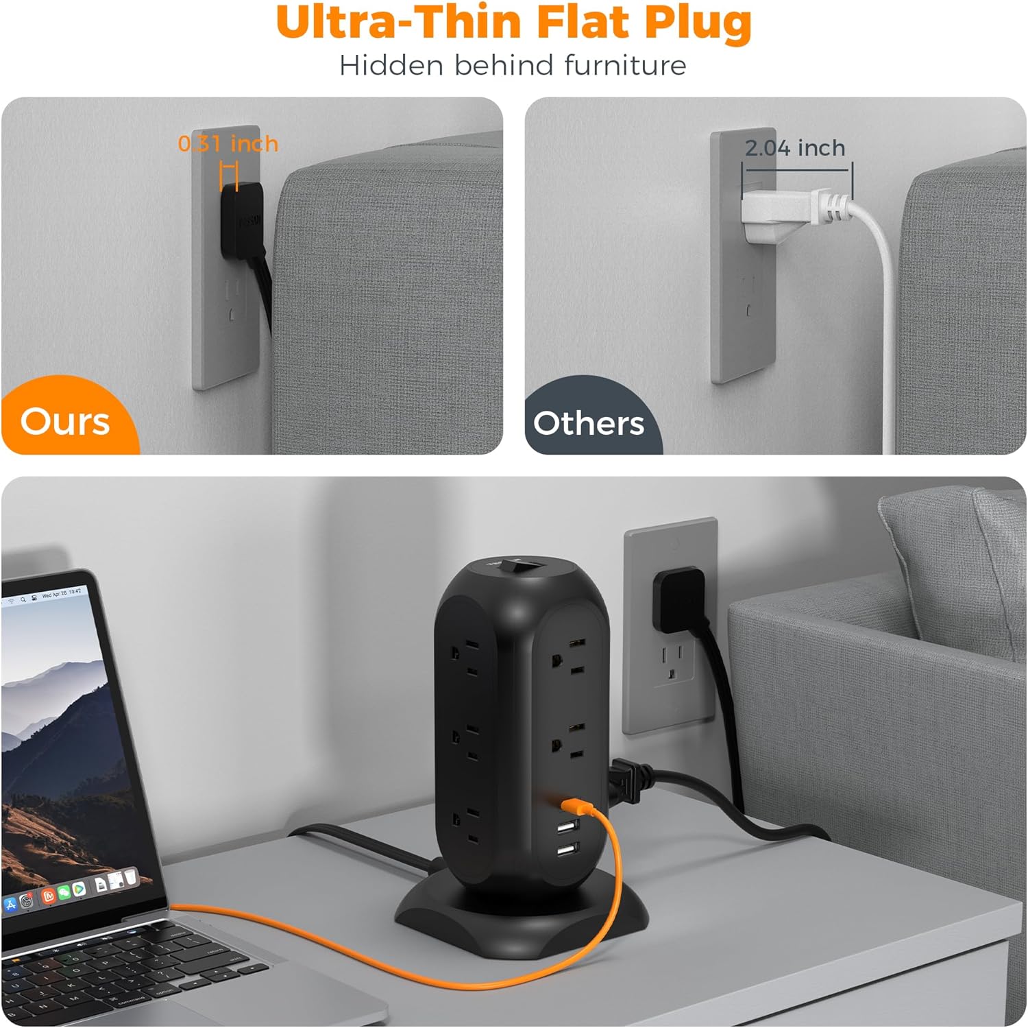 - Space-Saving: Equipped with an assortment of 11 AC sockets and 3 USB ports, this innovative power strip has sockets perpendicularly positioned to the floor, maximizing space compared to the conventional models. The ergonomic spacing and orientation of the sockets will allow better organization of the space as the whole system can be tucked away neatly into tight spaces and corners. Choose this office supplies, and make your desktop tidy.